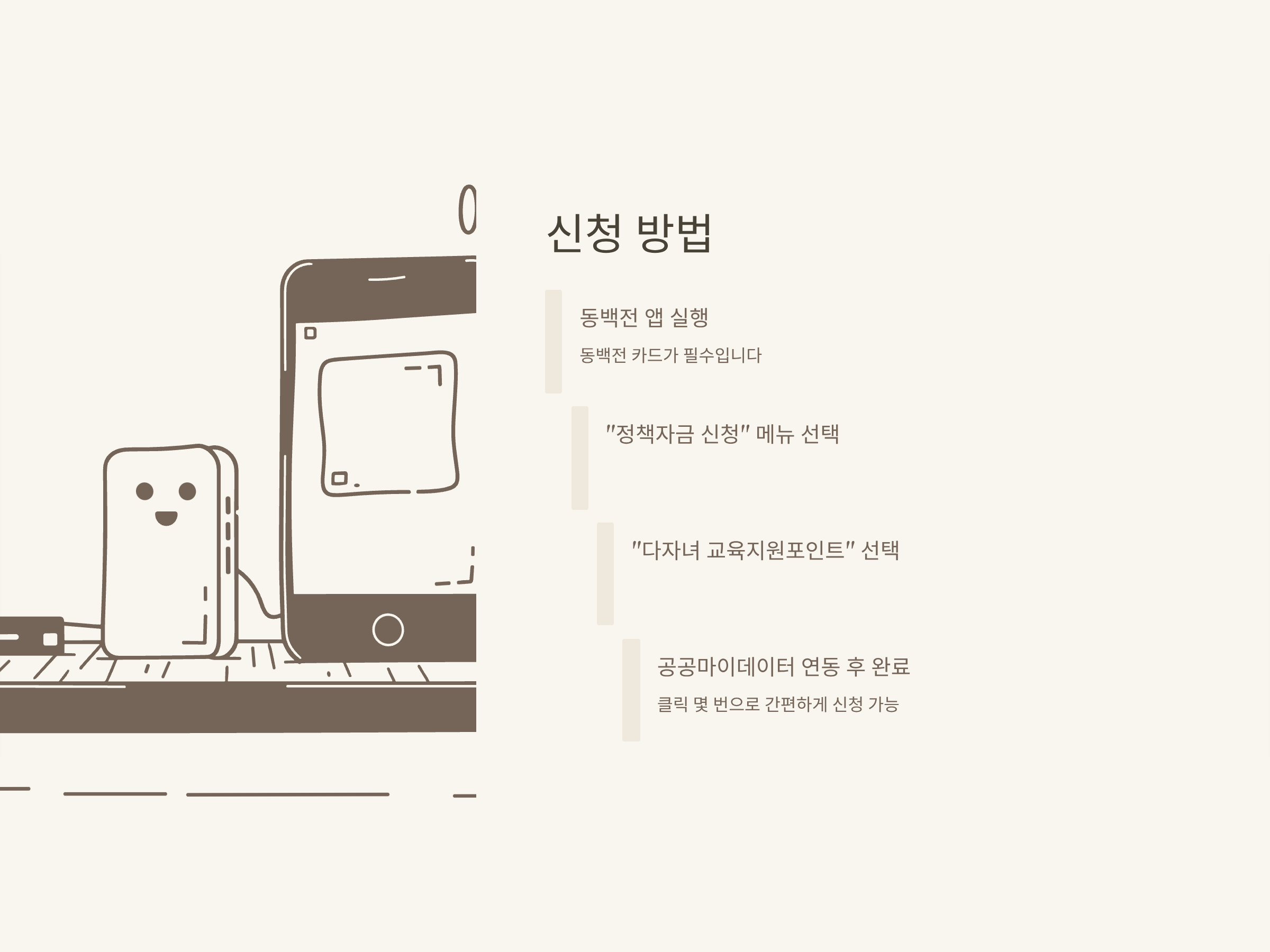 저는 동백전 앱에서 온라인으로 신청했는데, 공공마이데이터로 가족 확인이 바로 되어 절차가 정말 간단했습니다. 정책자금 메뉴에 ‘다자녀 교육지원포인트’가 보이면 클릭, 신청버튼 누르고 몇 단계만 거치면 끝입니다. 만약 동백전 카드가 없다면 미리 발급 받아두셔야 합니다.