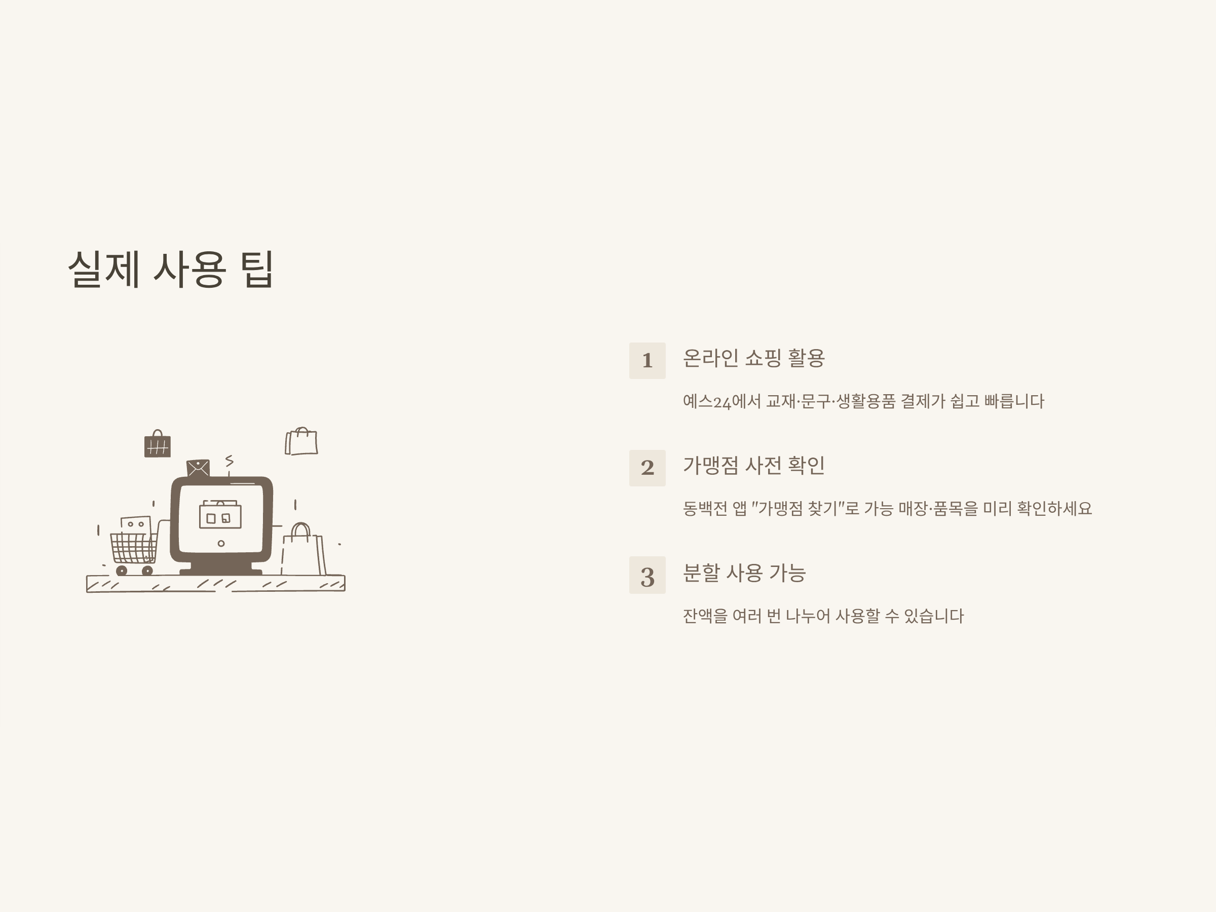 | 오프라인 팁 | 동백전 카드 결제 가능한 서점·문구점 미리 확인 |