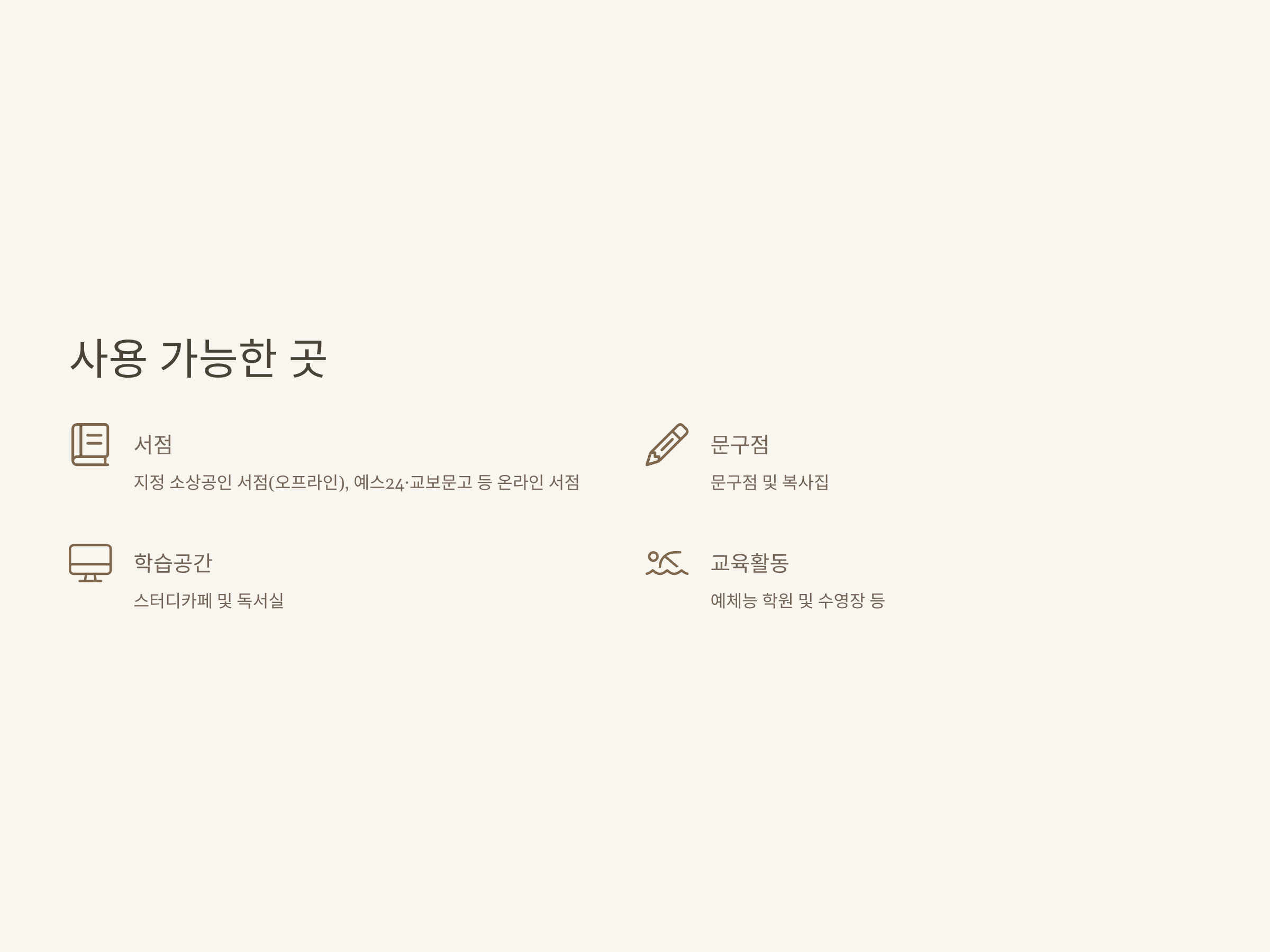 | 사용가능처 | 문구점, 서점, 스터디카페, 예체능 학원, 수영장 등 |