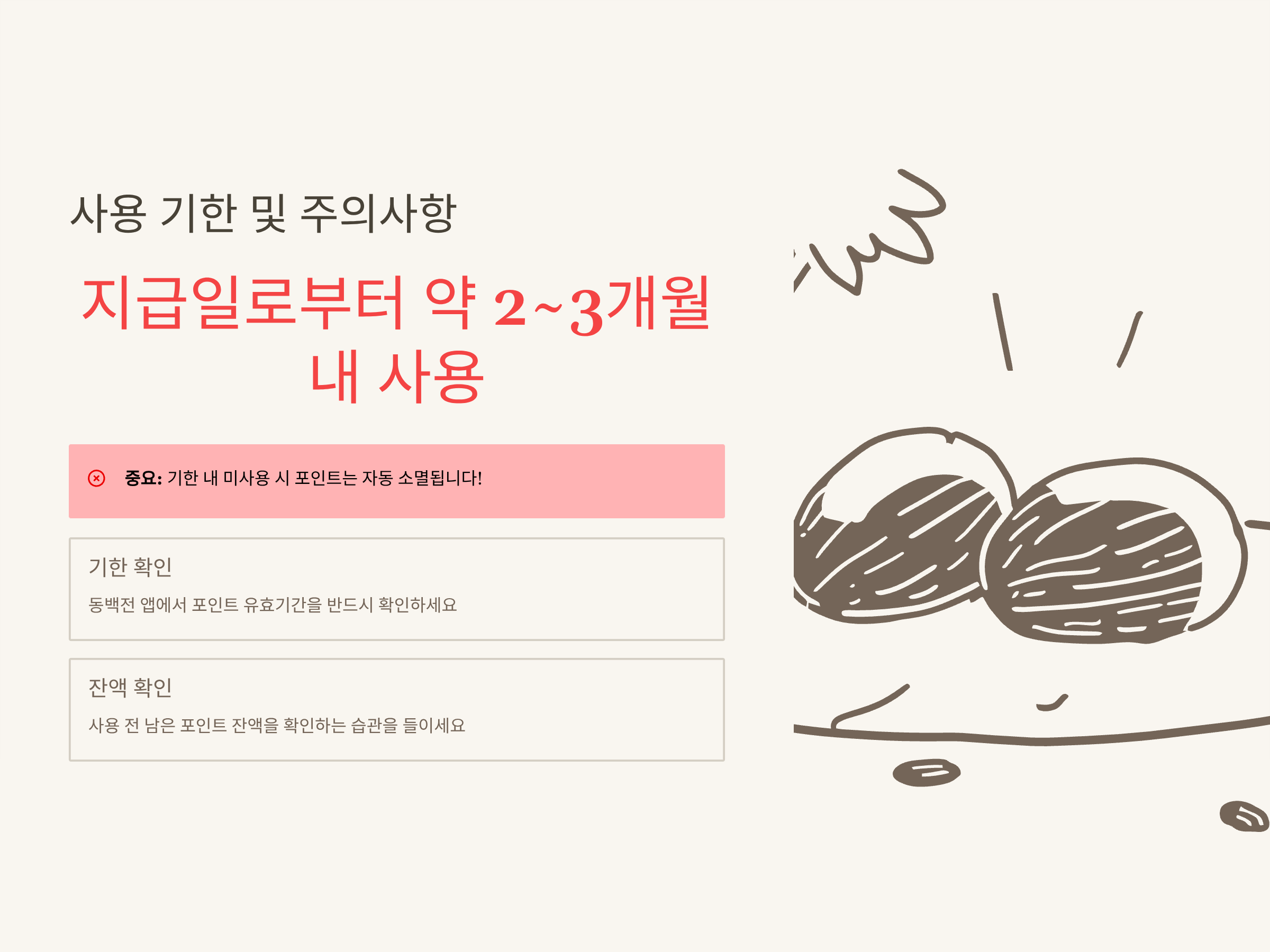- 포인트 사용 기한은 지급일 기준 2~3개월 내(마감일 확인 필수)