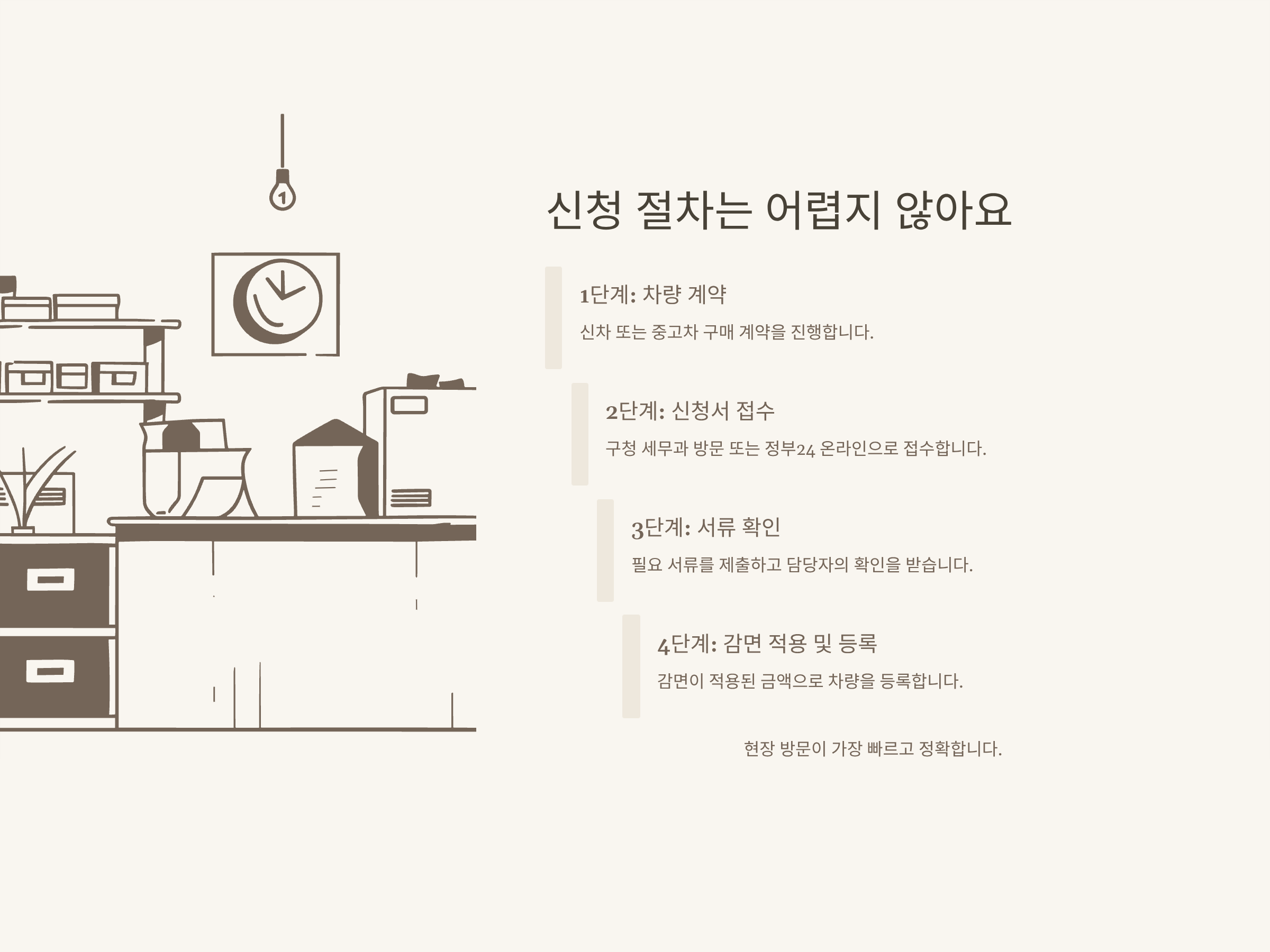 추가로, 중고차 매매상사에서도 감면 서류 준비와 안내를 도와주는 경우가 많으니 계약 전 미리 문의해보는 것이 좋습니다.