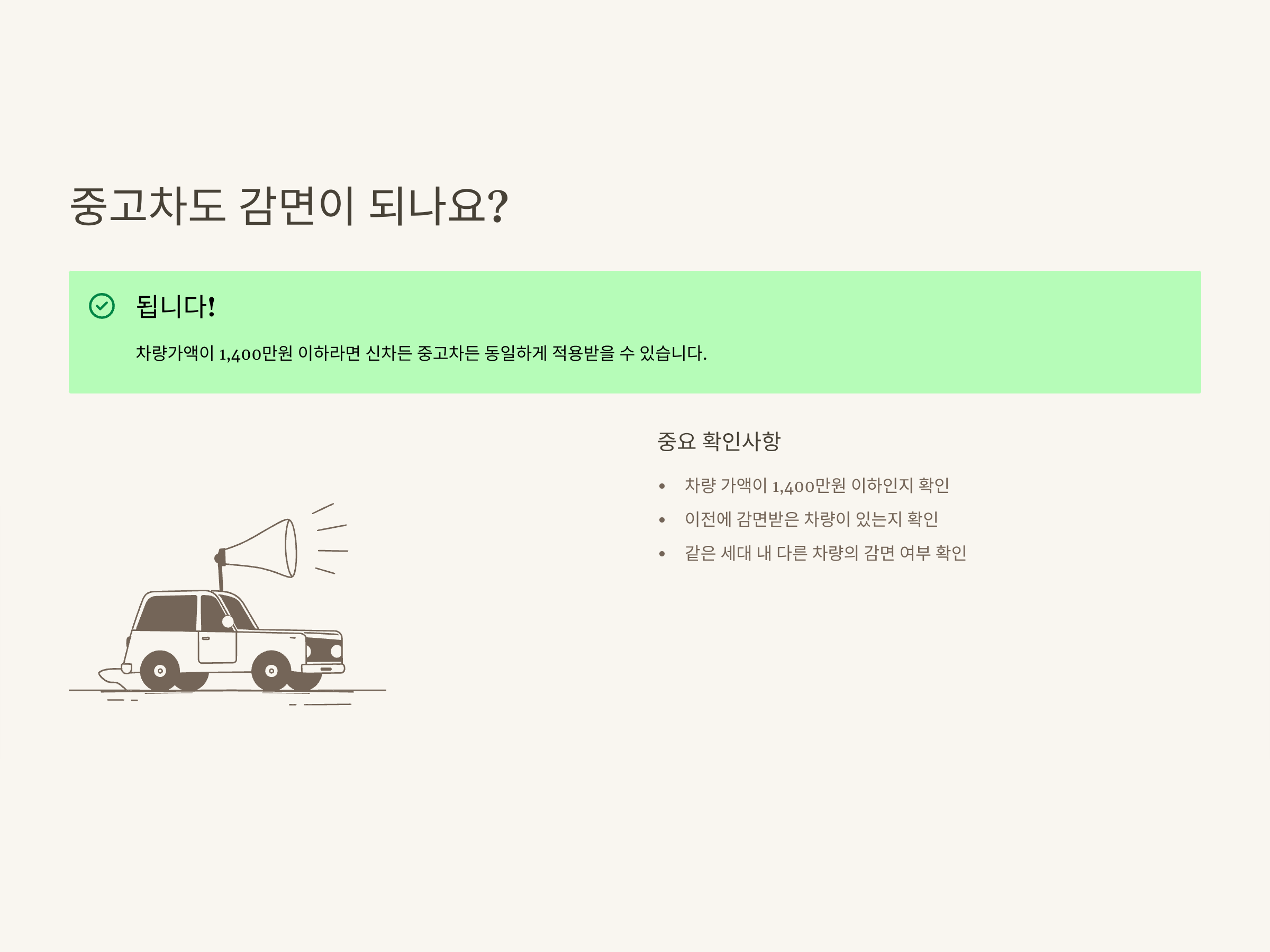 A. 네, 중고차도 감면 대상입니다. 단, 차량가액이 1,400만원 이하여야 하고, 1세대 1대 원칙이 동일하게 적용됩니다.