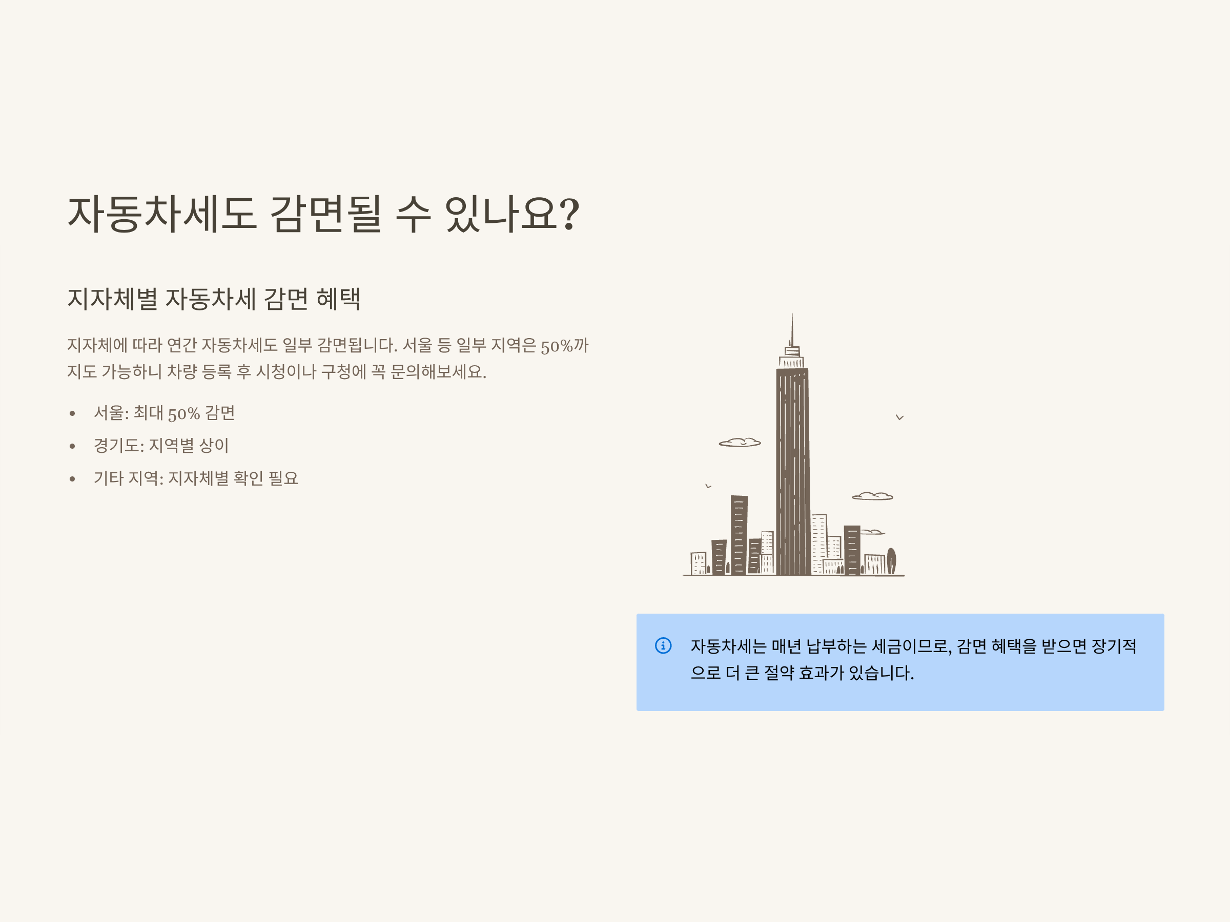 참고로, 서울시 자동차세 안내 등에서 지역별 세율과 감면 내역을 직접 확인할 수 있습니다.