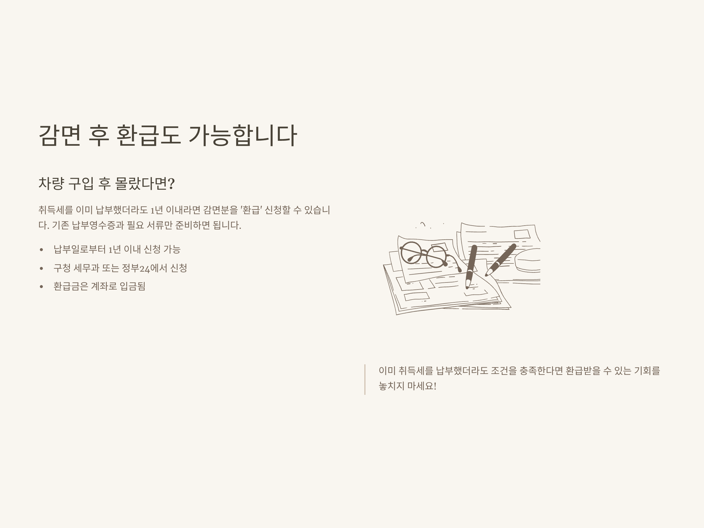 저는 차를 구입한 지 3개월 후에 감면 사실을 뒤늦게 알고 구청에 환급 신청을 했었는데요, 담당자가 친절하게 절차를 안내해줘서 어렵지 않게 진행할 수 있었습니다. 구청 세무과에서 환급 신청서와 기존 취득세 영수증, 다자녀 증빙서류를 제출하면, 심사 후 통상 1~2주 내로 계좌로 환급이 들어옵니다. 직접 방문이 어렵다면 등기우편이나 온라인(정부24)으로도 일부 환급 신청이 가능하니 상황에 맞게 선택하시면 됩니다.