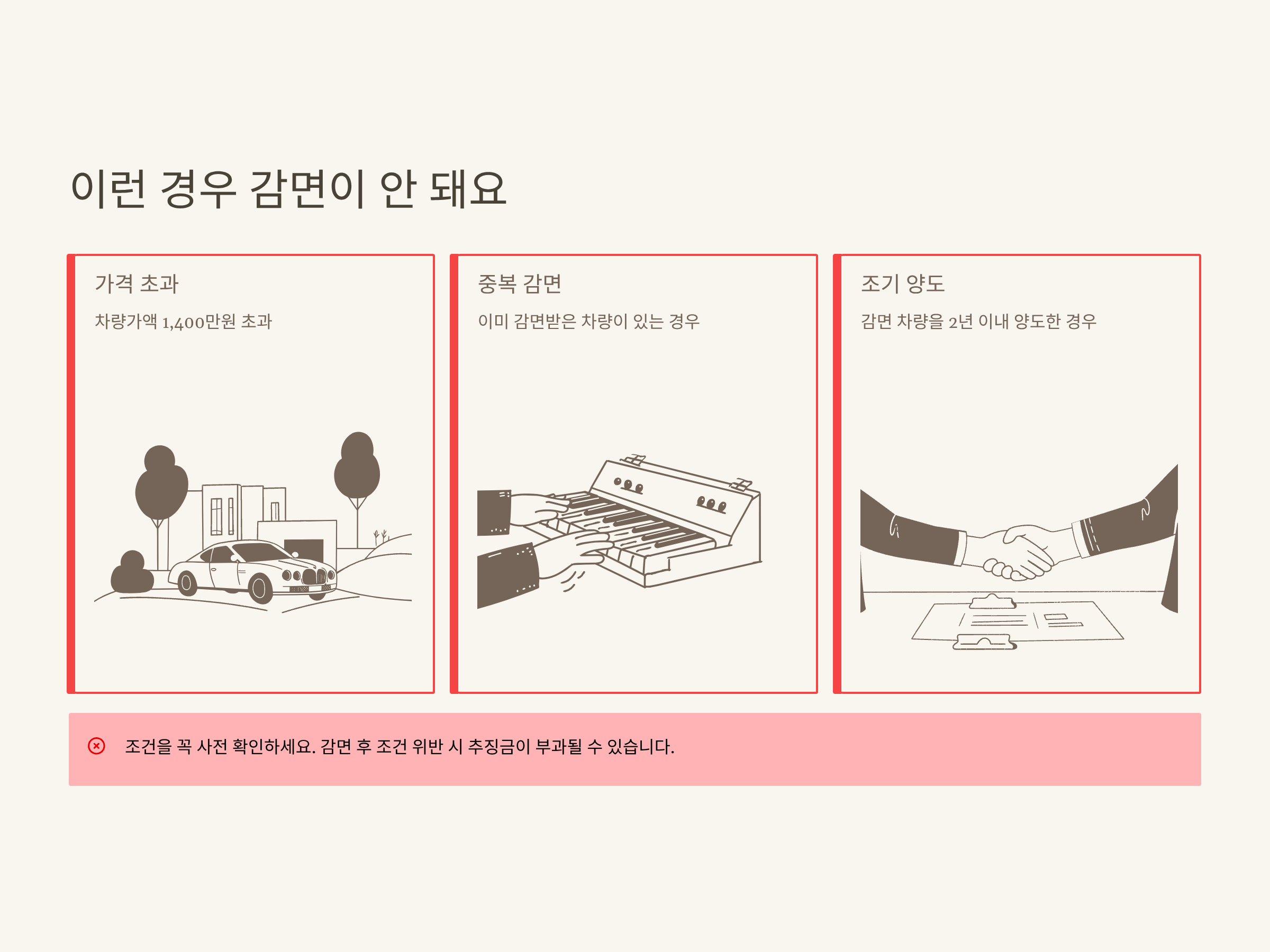 또, 차량가액 1,400만원을 초과하거나 승합/화물차 등 감면 대상 외 차량을 구입할 경우, 감면 자체가 적용되지 않습니다. 그리고 감면받은 차량을 2년 이내 양도(매각, 증여 등)하면 감면 취득세를 추징당할 수 있으니 실제로 2년 이상 유지하는 게 안전합니다.
