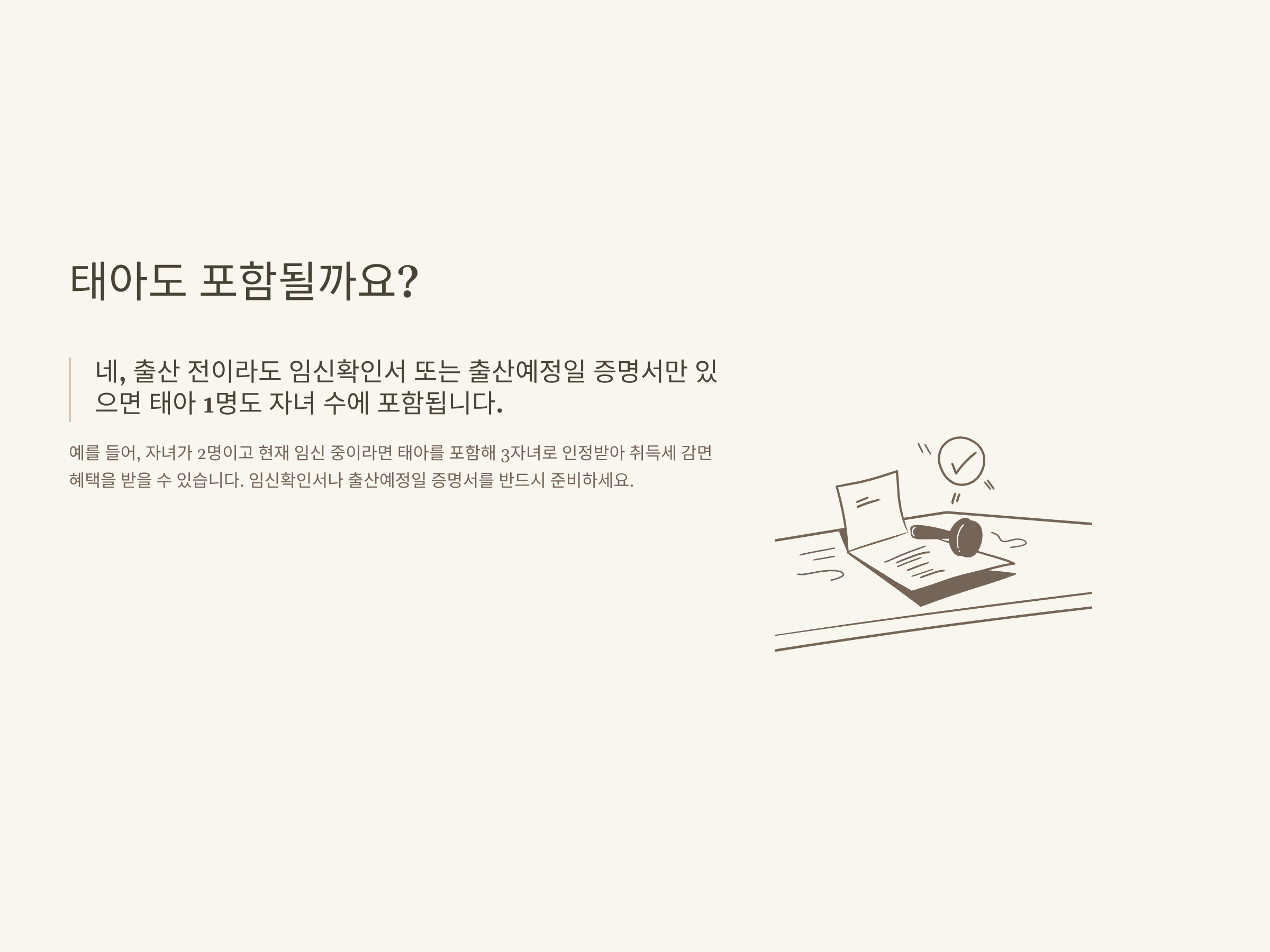 또한, 가족 구성원 정보가 실시간으로 연동되어 ‘자녀 수’ 산정이 더 정확해졌으니, 주민등록등본과 가족관계증명서 발급 시 최신 정보로 준비하는 게 중요합니다. 태아 포함 여부, 1세대 1대 원칙 등은 여전히 동일하니, 서류 미비나 착오로 불이익을 받지 않으려면 구입 전 반드시 구청 세무과와 사전 상담을 추천합니다.