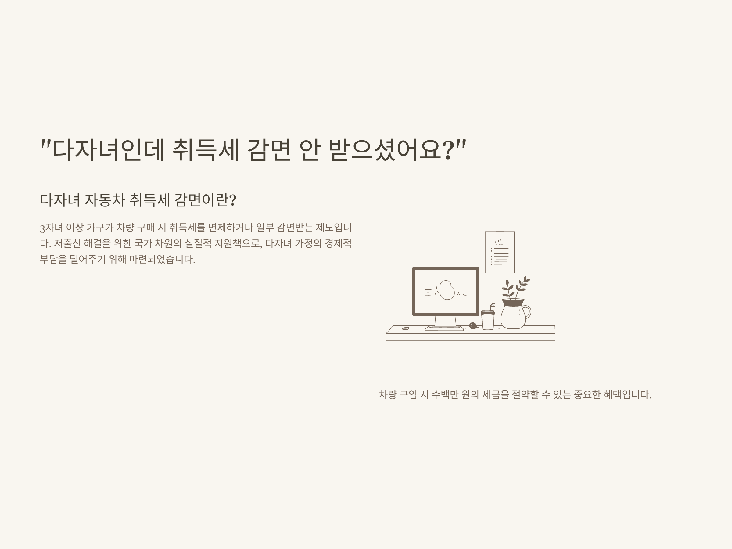 다자녀 자동차 취득세 감면 제도가 복잡해서 실제로 신청해보려 할 때마다 헷갈리셨던 적 있으신가요? 저 역시 첫 아이 때는 남 얘기처럼 듣고 지나쳤는데, 둘째 출산 이후 자동차를 바꾸면서 저도 직접 다자녀 취득세 감면을 경험했습니다. 저처럼 실제로 자동차를 구매하거나, 중고차를 알아보면서 서류 준비부터 환급까지 고민이 많으셨던 분들을 위해, 오늘은 2024년 기준으로 다자녀 자동차 취득세 감면의 모든 것! 실사례와 팁까지 담아서 솔직하게 안내해드리겠습니다.