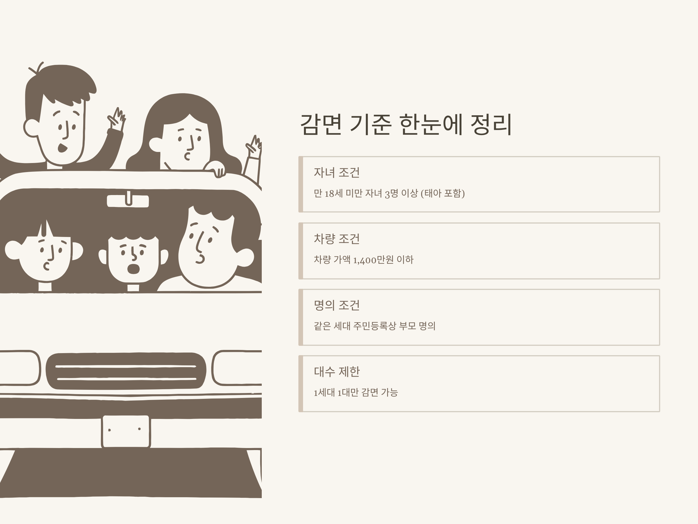 2024년 현재 기준으로, 감면을 받으려면 ‘만 18세 미만 자녀가 3명 이상’이어야 하며, 태아도 1명으로 포함됩니다. 즉, 자녀 2명에 임신 중이라면 3자녀로 인정돼요. 또, 부모와 자녀 모두 주민등록상 같은 세대여야 하고, 자동차 가격(과세표준 기준)이 1,400만원 이하인 차량이어야 감면이 적용됩니다.