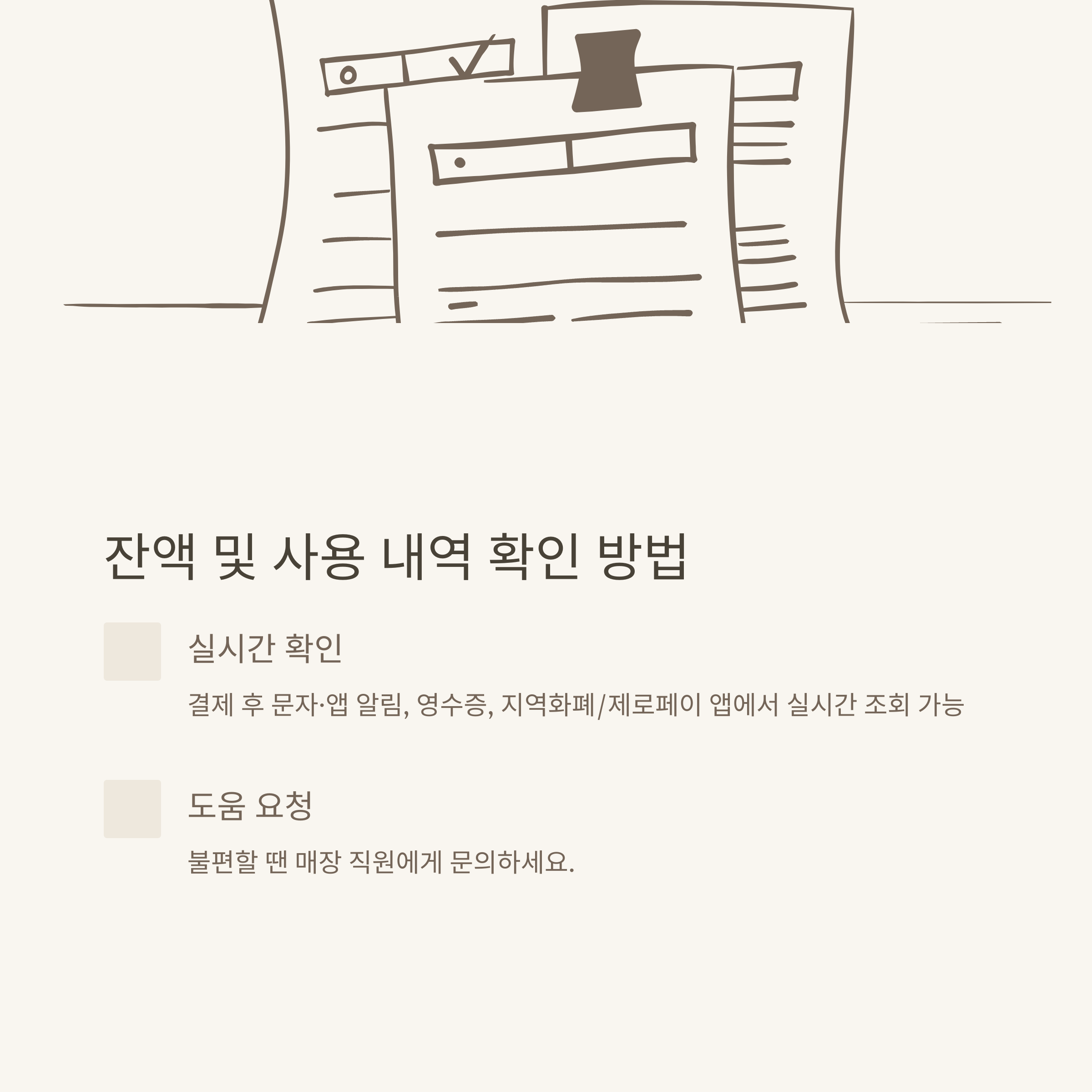 - 잔액이 부족하면 현금·카드 추가 결제 가능 여부 미리 체크