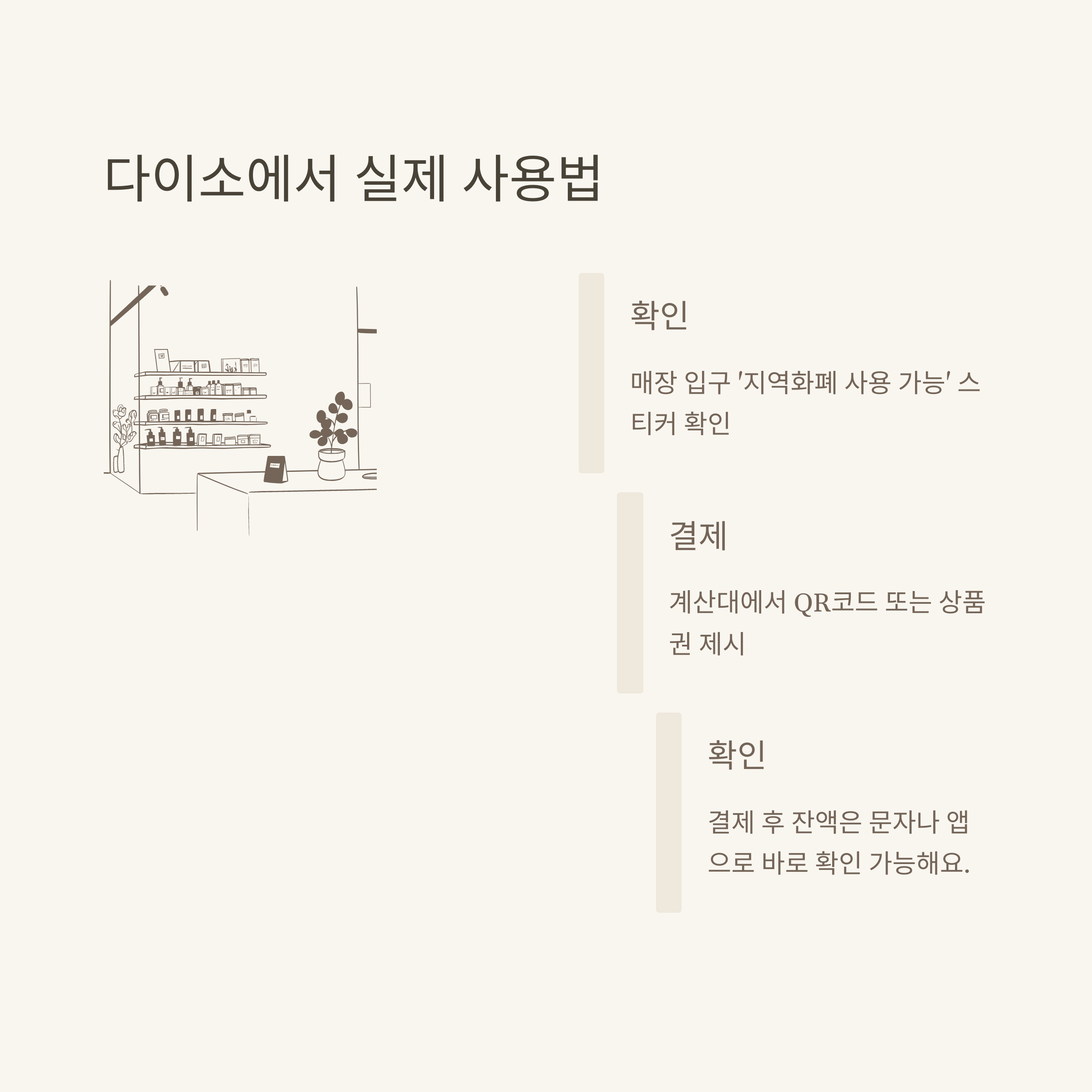 A. 대부분의 다이소 매장에서 사용할 수 있으나, 일부 지점은 불가할 수 있으니 입구의 ‘지역화폐 사용 가능’ 표시를 꼭 확인하거나 직원에게 문의하세요. - Q2. 쿠폰 사용 후 남은 잔액은 어떻게 확인하나요?