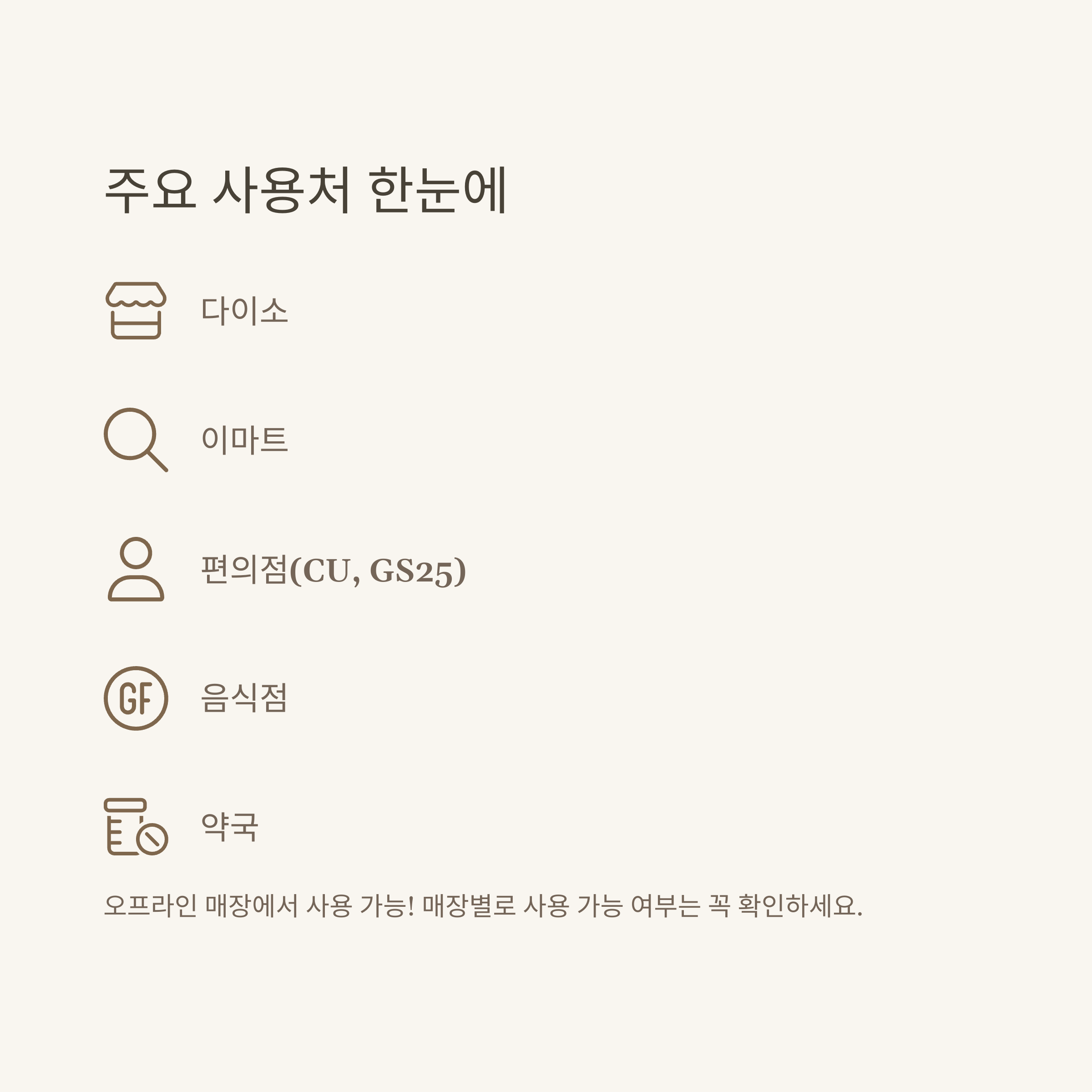 | 사용처 | 다이소, 마트, 편의점, 제휴 음식점 등 오프라인 매장 중심 |