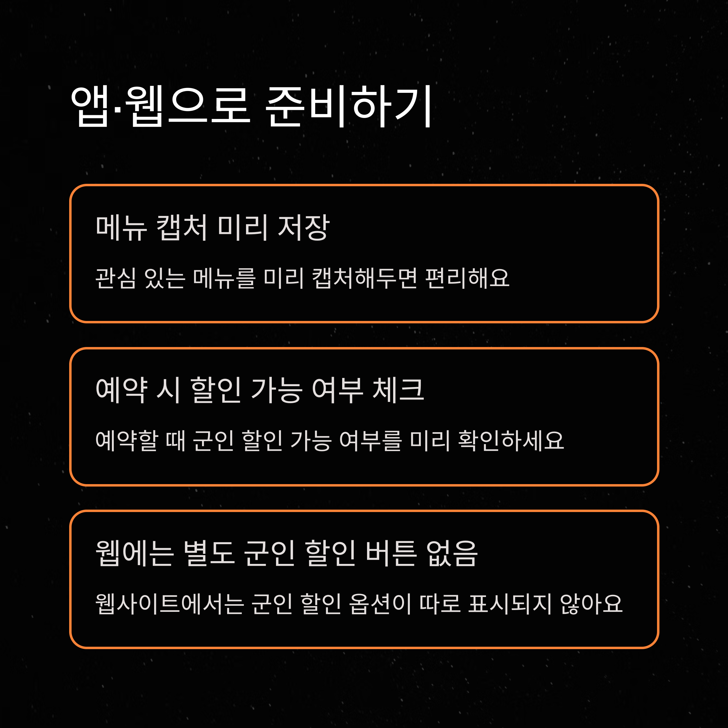 - 예약할 때 “군인 할인 가능 지점 맞나요?” 먼저 확인