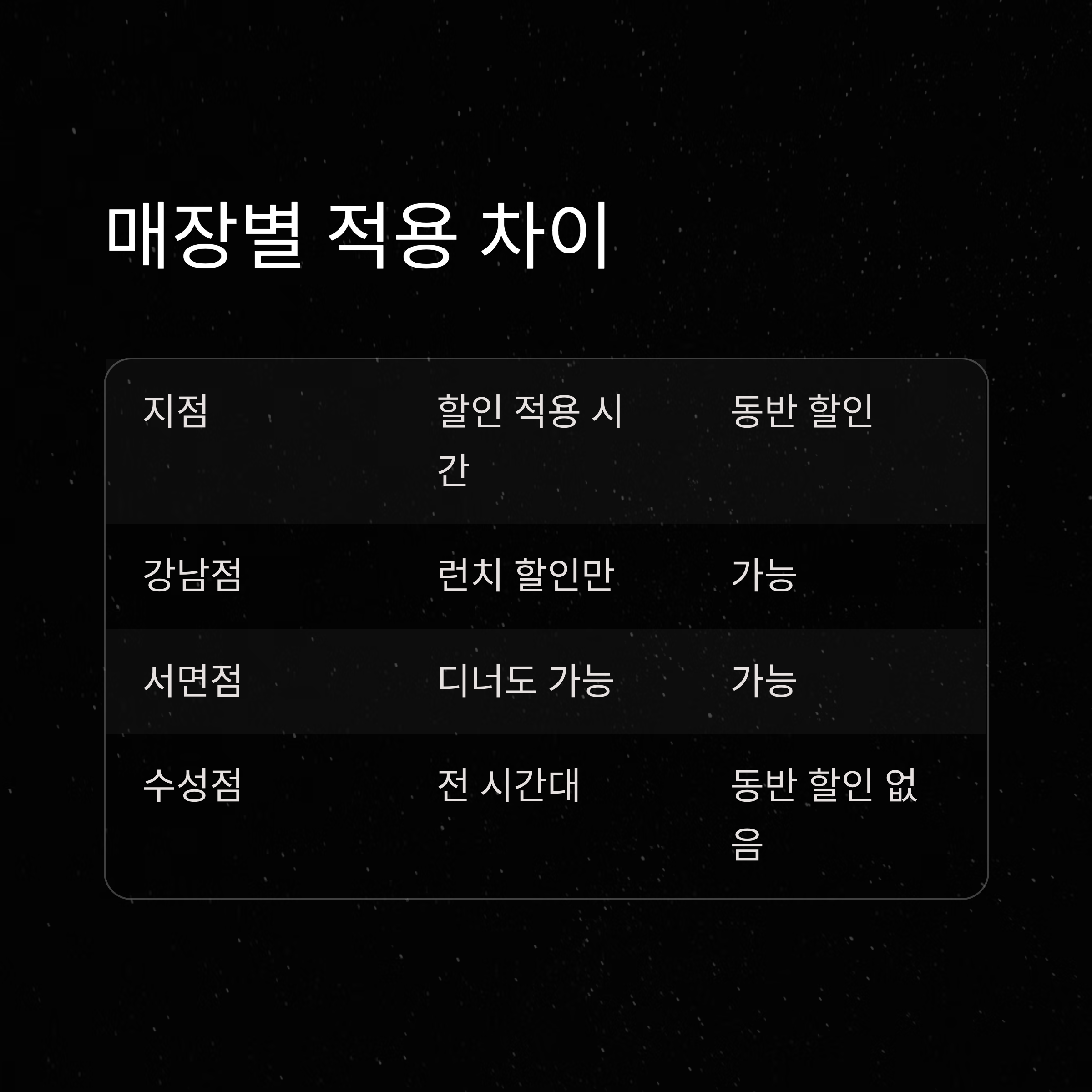 강남·신촌·부산 등 매장별로 할인율이나 정책 차이가 있었어요. 예를 들어 부산 서면점은 디너 군인 할인도 적용되어 만족스러웠습니다.