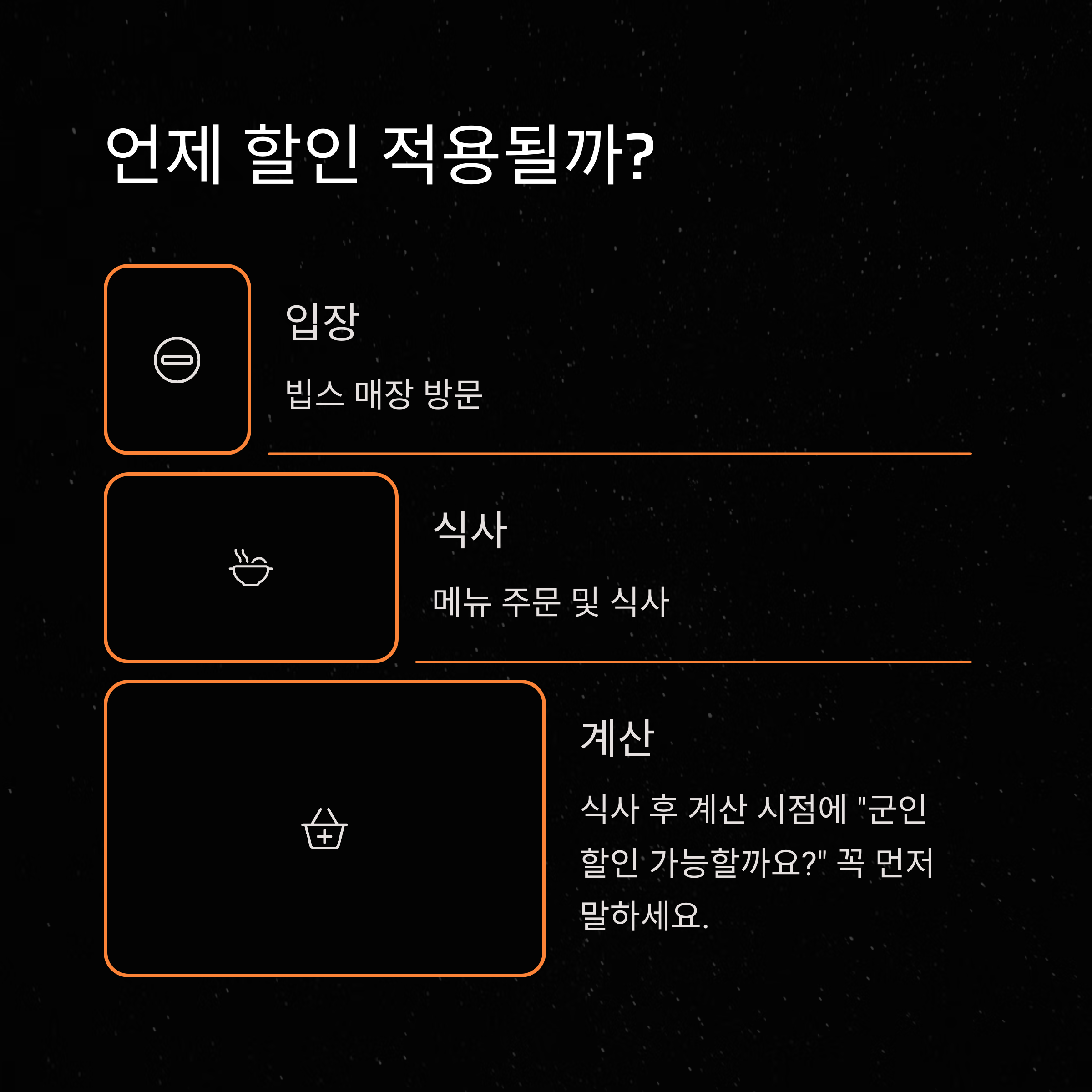 제가 처음 빕스에서 군인할인을 받았던 건 강남점에서 외출 나갔을 때였습니다. 계산하려는 순간 직원분이 “혹시 군인이시면 20% 할인됩니다”라고 말씀해주셔서 바로 나라사랑카드를 제시했죠. 빕스 군인 할인 대상자: