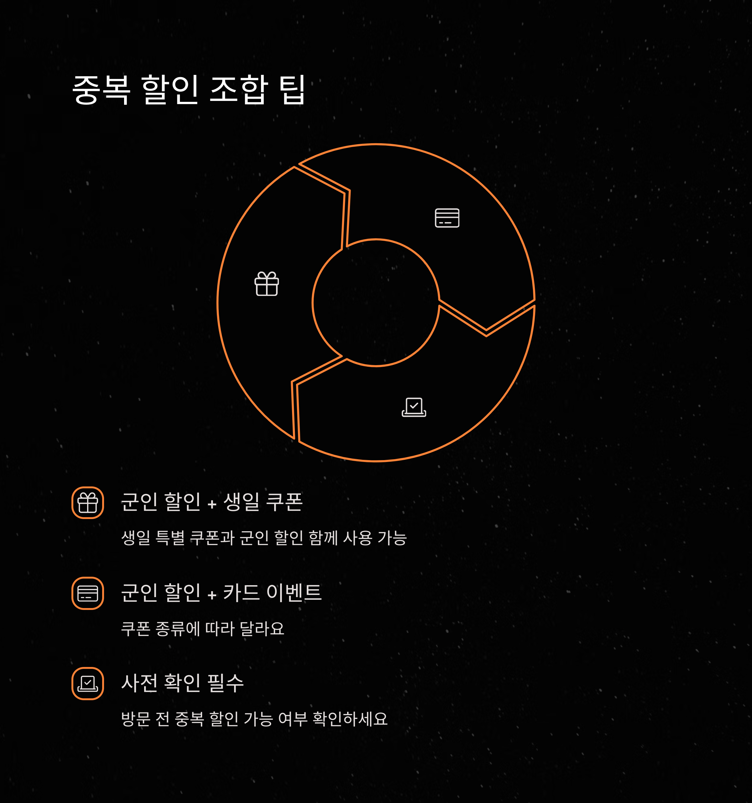 - 군인 할인 + 통신사 멤버십 (중복 적용 어려움)