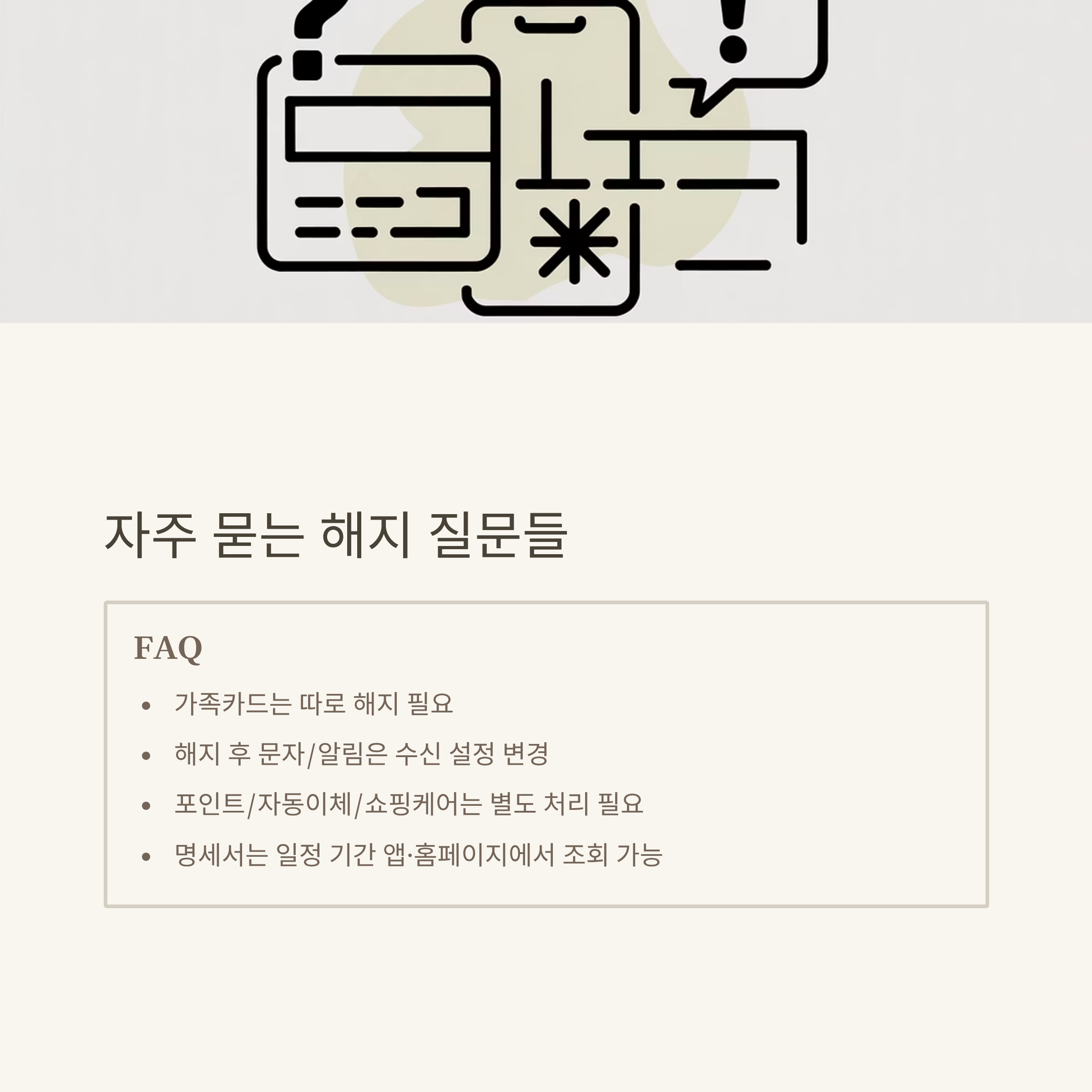 해지 완료 시 해지 확인 문자 또는 앱 푸시가 발송됩니다. 해지일 기준으로 연회비 환불 가능 여부, 잔여 포인트 소멸 유무도 함께 안내되니 꼭 확인하세요.
