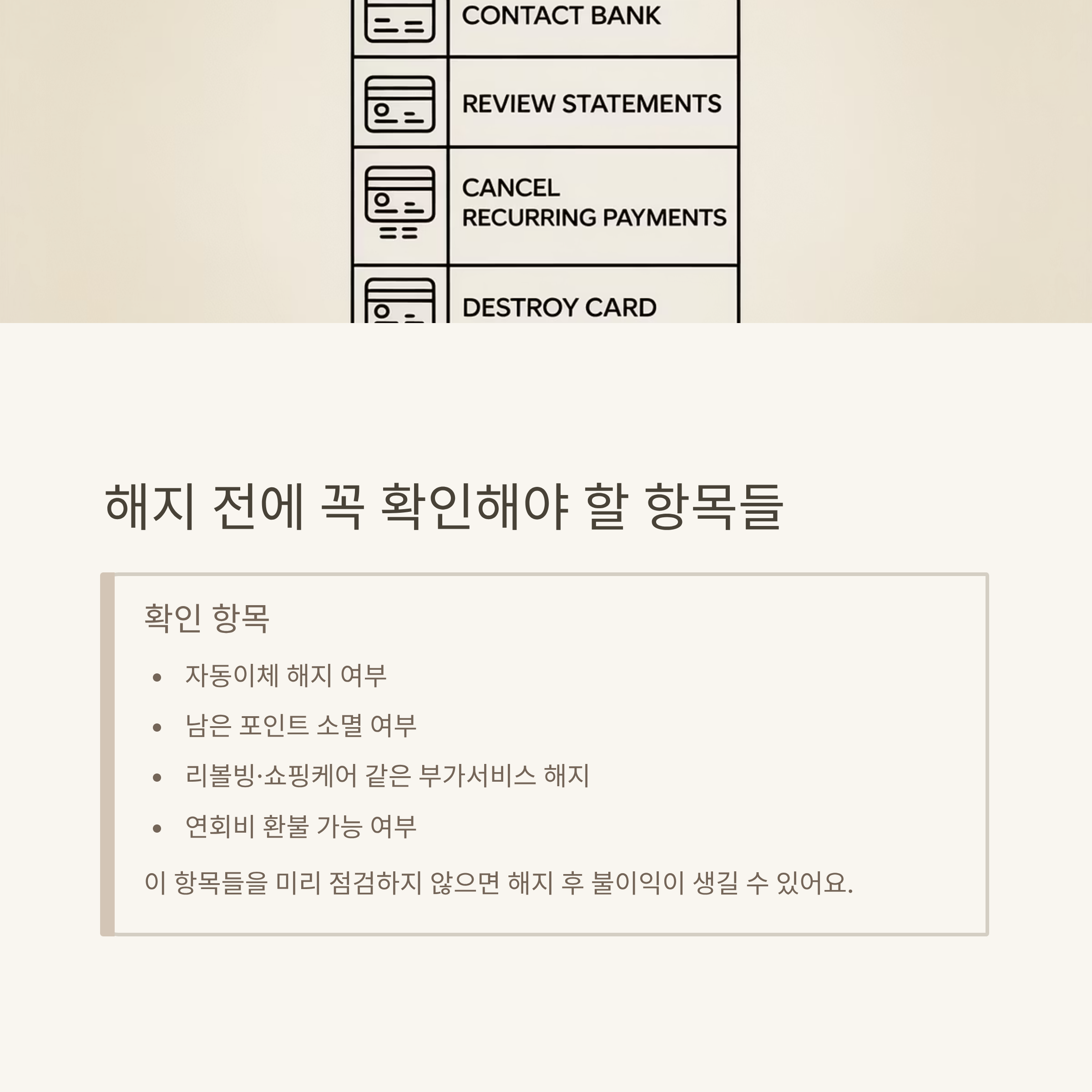 만약 포인트나 서비스가 남아 있다면, 해지 전 소진하거나 해지 절차를 따로 진행해주는 것이 좋습니다. 저는 자동이체 해지하지 않고 카드만 해지했다가 통신비 납부가 미납돼서 곤란했던 적도 있었어요.