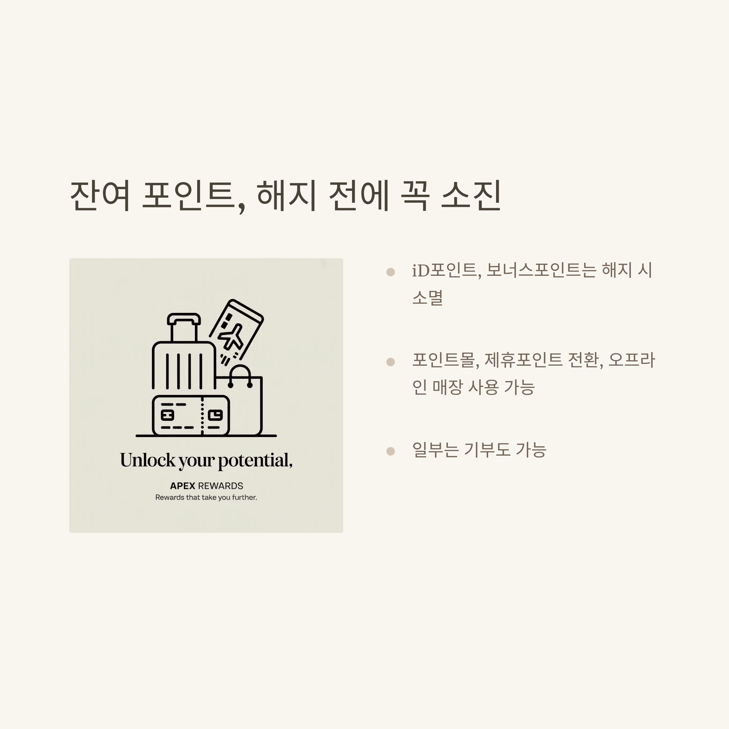 iD포인트와 보너스포인트는 해지 즉시 소멸될 수 있기 때문에, 되도록 해지 전 100% 사용을 추천드립니다. 일부 카드사처럼 타 카드로 이관하는 기능은 삼성카드에서는 제공되지 않더라고요.