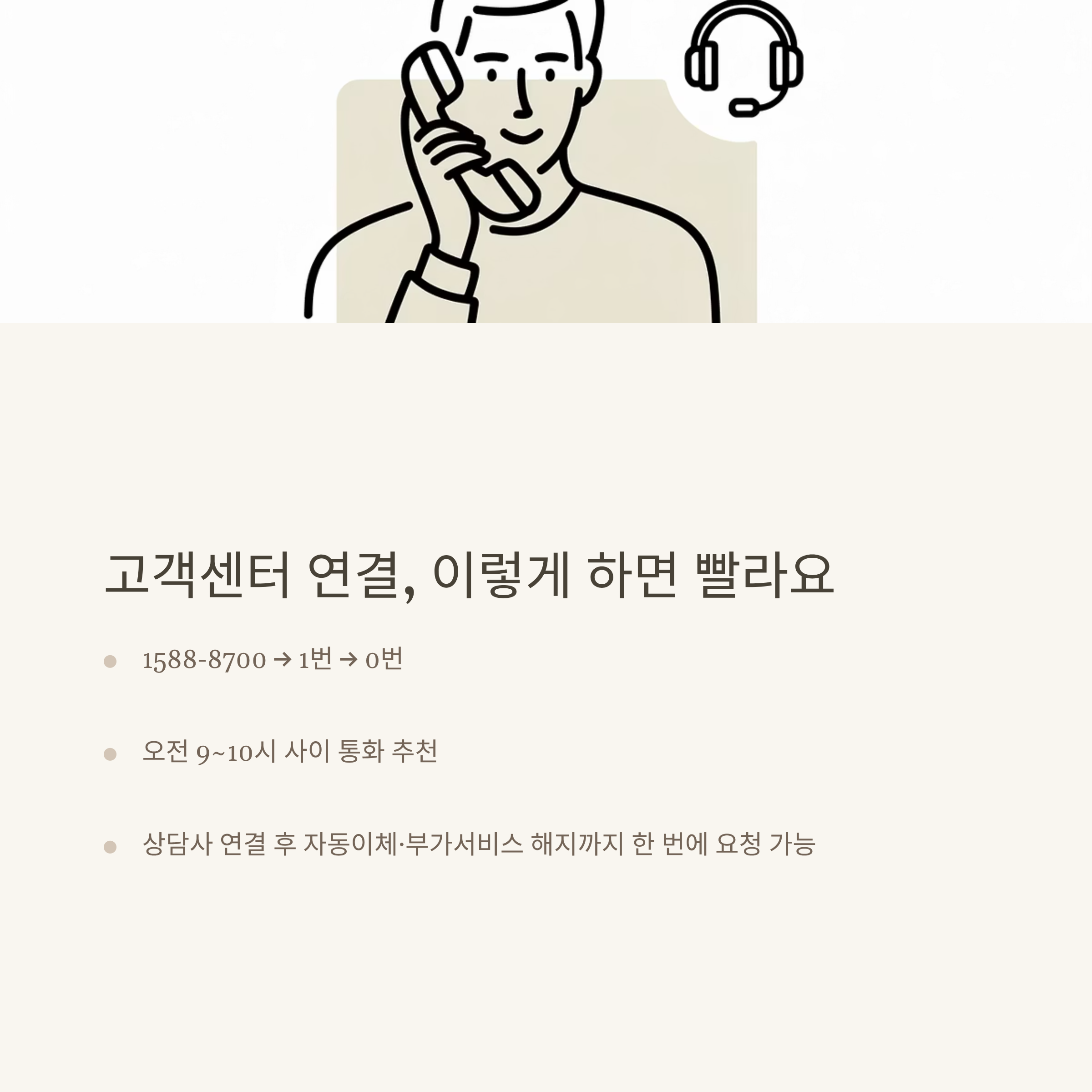 - 고객센터 1588-8700 → 상담사 연결 후 해지 요청