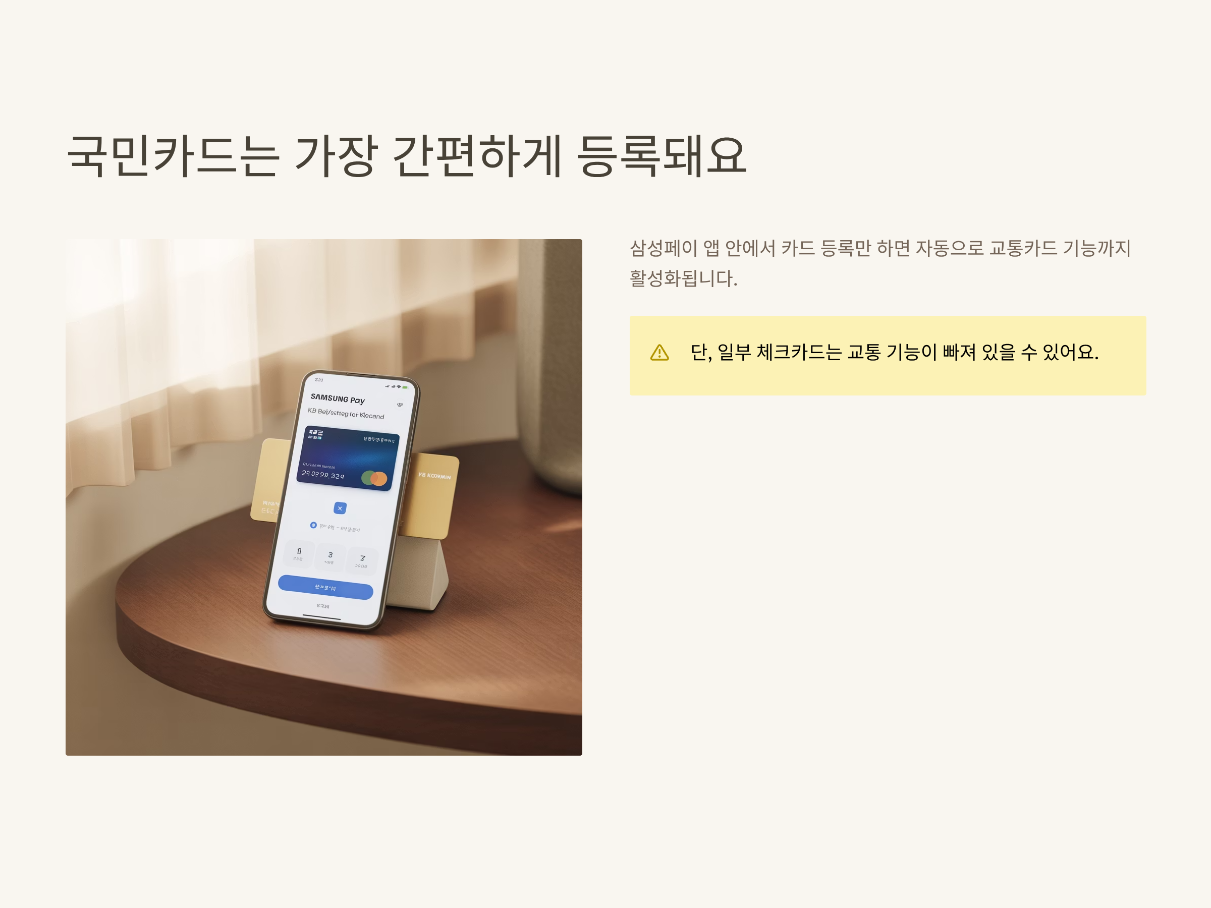 국민카드는 삼성페이와의 연동이 가장 매끄럽고, 따로 고객센터 전화나 다른 인증절차 없이 교통카드 기능까지 바로 사용할 수 있었어요. 다만, 유의할 점은 체크카드 일부는 교통카드 기능이 비활성화되어 있을 수 있다는 점입니다.