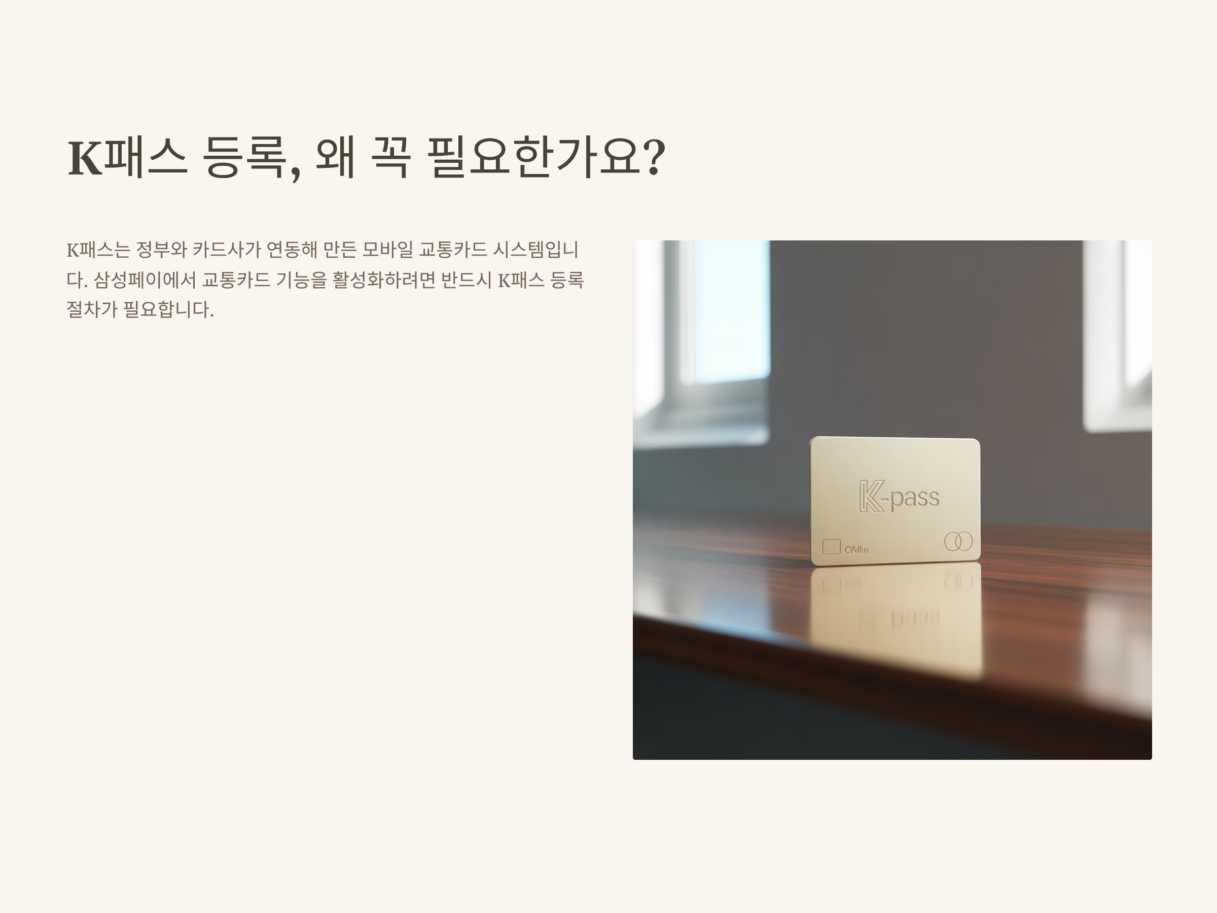 제가 처음 삼성페이를 교통카드로 쓰려고 했을 때, ‘K패스 등록’이라는 단어가 제일 먼저 눈에 들어왔습니다. 단순히 삼성페이에 카드를 등록하는 것만으로는 안 되더라고요. K패스는 모바일 교통카드 기능을 활성화시키기 위한 추가 등록 절차입니다.