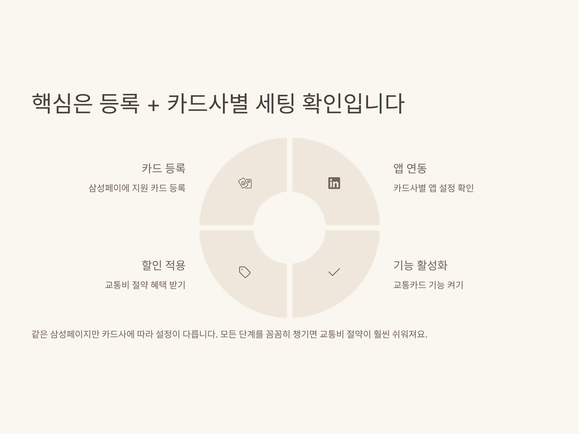| 단말기 인식 안 됨 | NFC 꺼짐 / 교통기능 미활성화 | 삼성페이 NFC 설정 확인, 교통 ON 체크 |