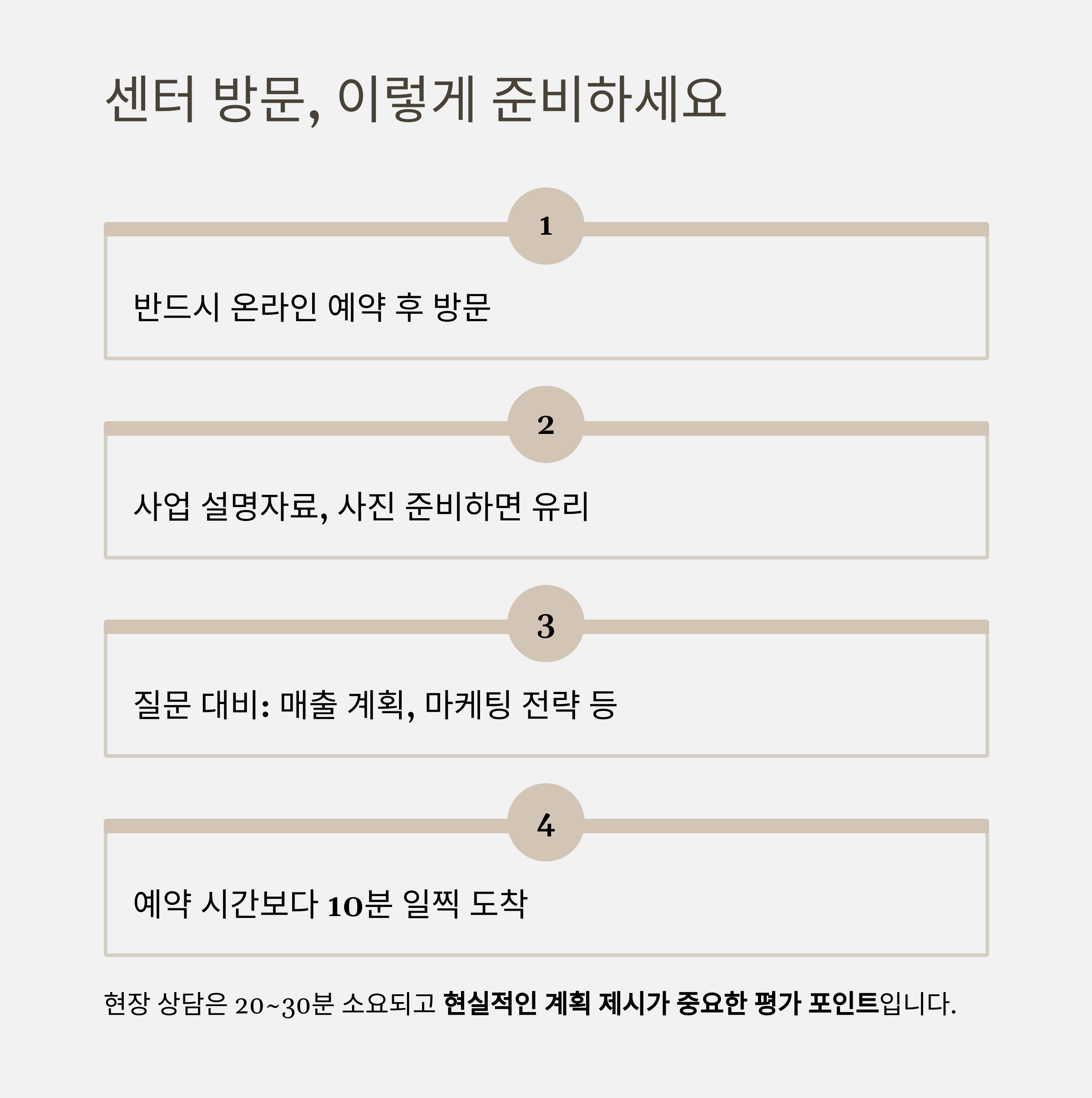 센터 방문은 단순 서류 제출이 아니라 심사 대상자가 직접 상담을 받는 절차이기도 합니다. 저도 막상 가보니 서류만으로 끝나는 줄 알았는데, 사업 방향에 대해 꽤 자세한 질문을 받았어요. 방문 전 팁 5가지: