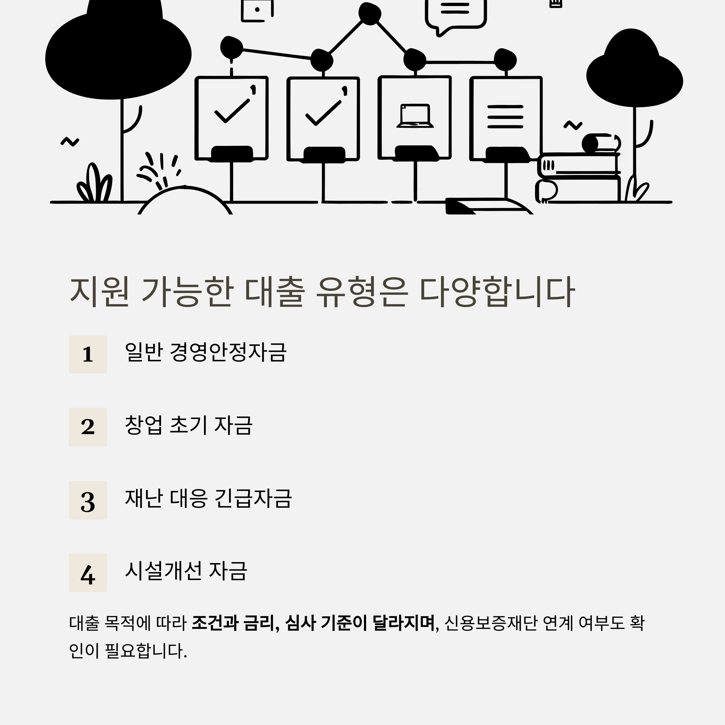 | 시설개선 자금 | 장비 도입, 인테리어 개선 등 설비투자 목적 |