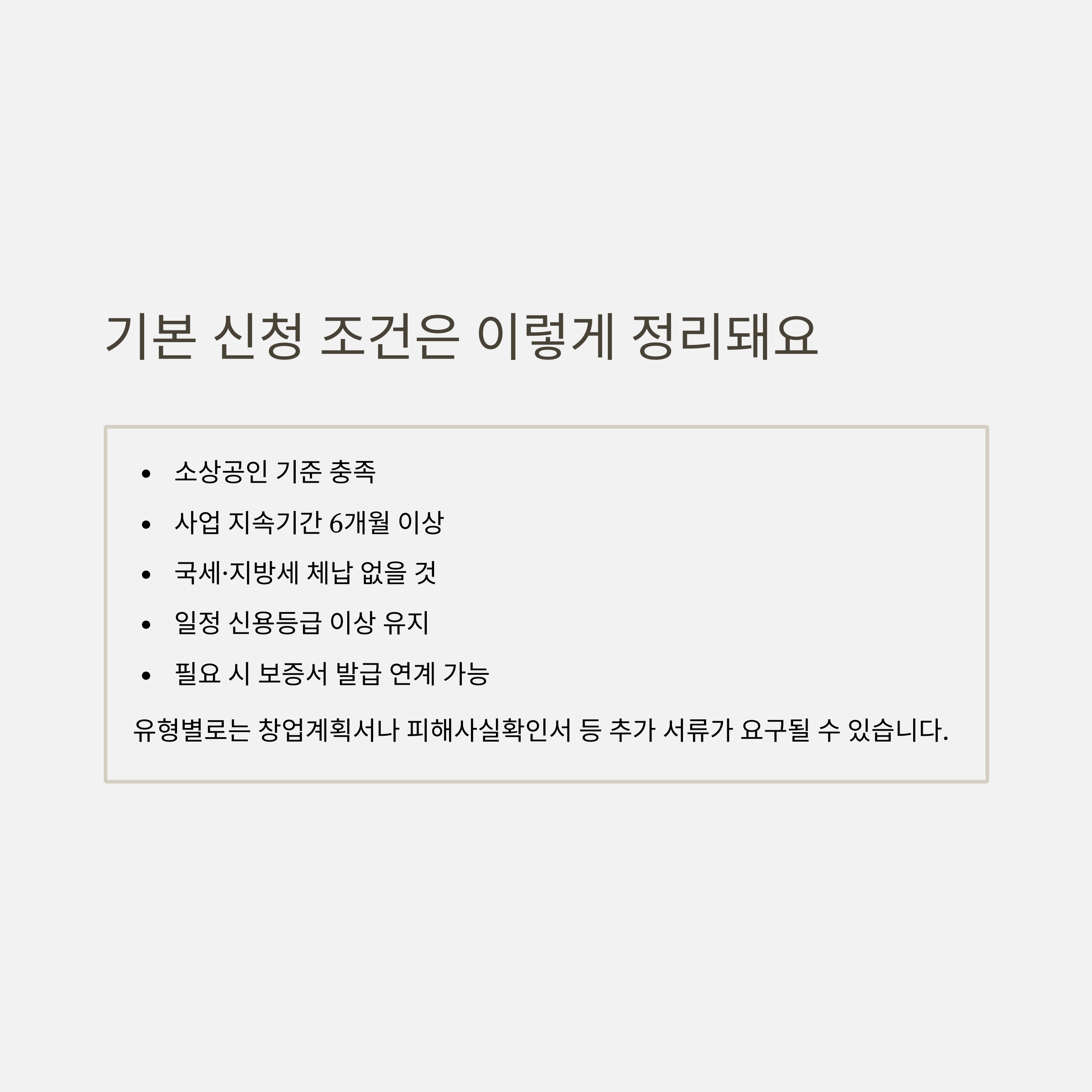 저는 ‘사업자등록증만 있으면 되는 줄’ 알고 대출센터를 찾았다가, 몇 가지 요건이 있다는 걸 뒤늦게 알았습니다. 소상공인 대출지원 대상은 다음과 같은 기준을 충족해야 합니다.