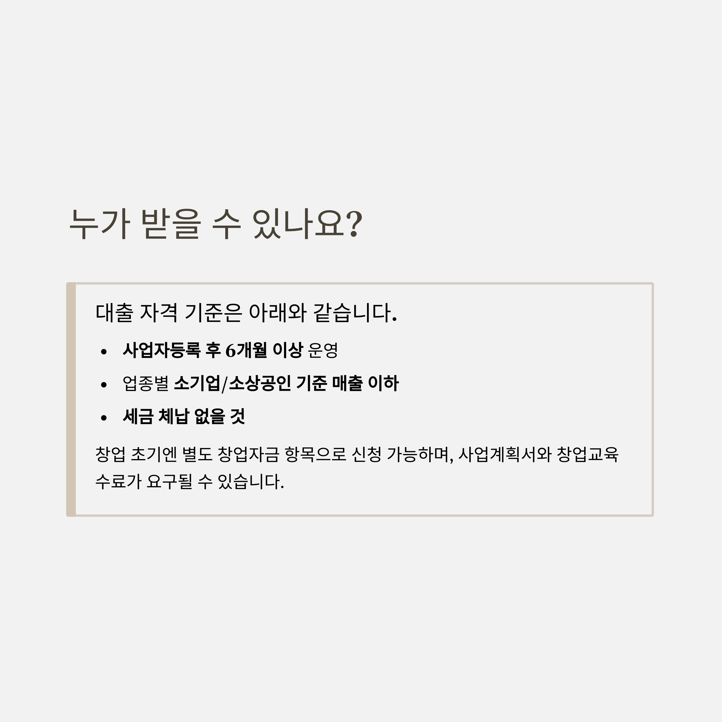 - 사업자등록 후 6개월 이상 정상 영업 중인 소상공인