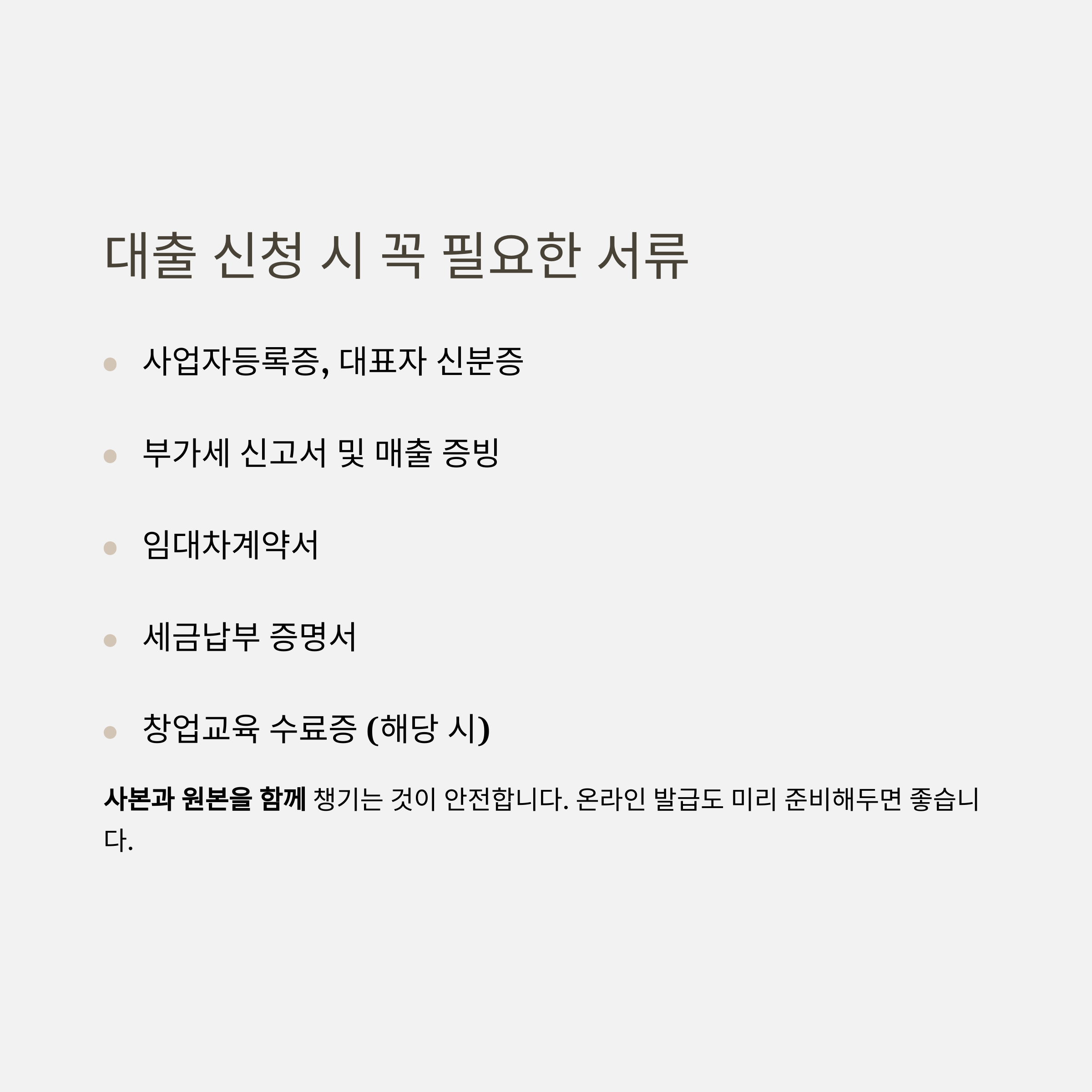 저는 운영자금 대출을 신청했는데, 국세청 홈택스에서 부가세 신고내역을 출력해서 제출했어요. 심사는 생각보다 빠르게 진행됐고, 일주일 안에 결과가 나왔습니다.