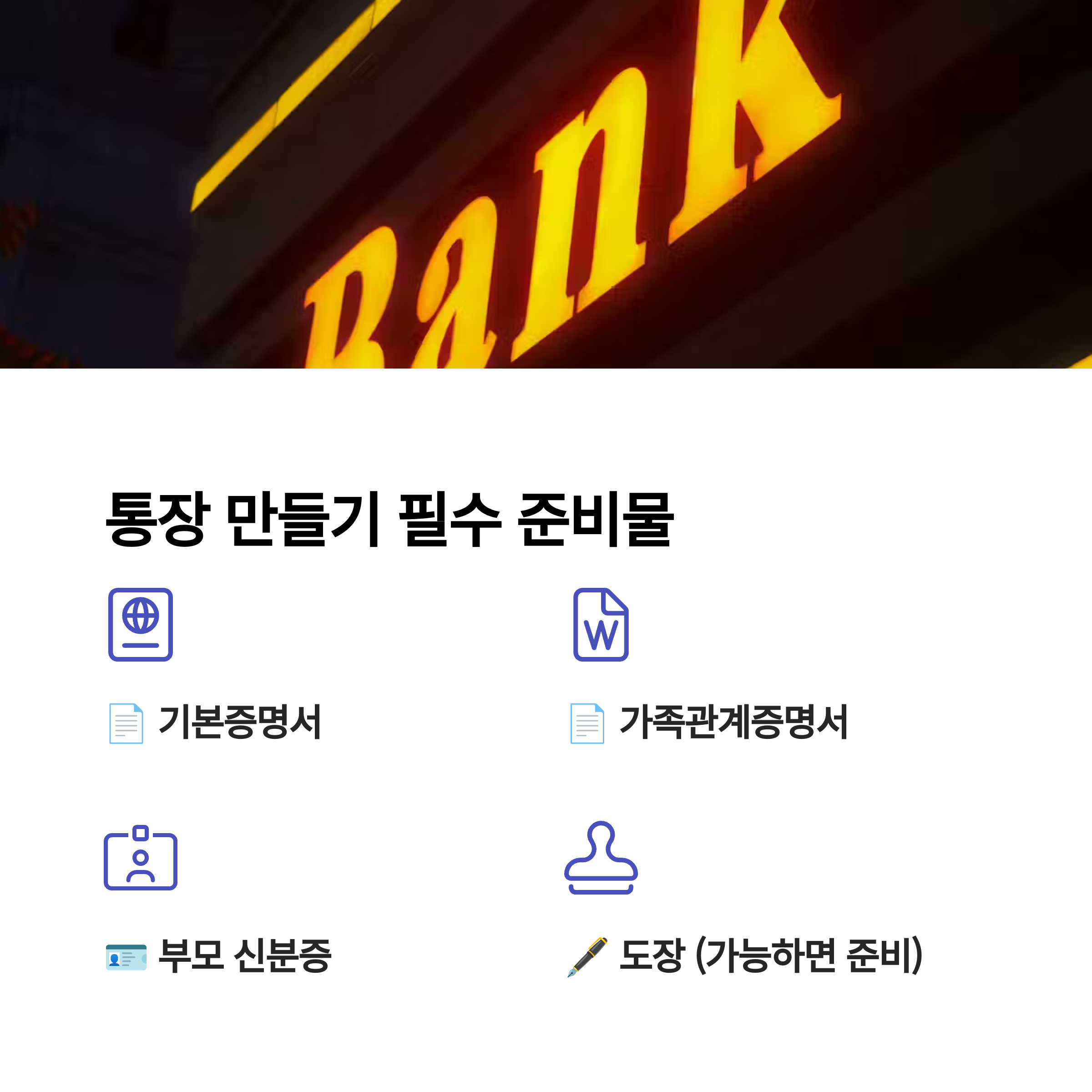 저는 실제로 국민·농협·신한은행에서 아기 통장 만들기를 위해 필요한 서류를 직접 챙기면서, 어떤 것이 필수인지 확실히 알게 되었어요. 이 섹션에선 준비물이 헷갈리시는 분들을 위해 꼼꼼하게 정리했습니다.