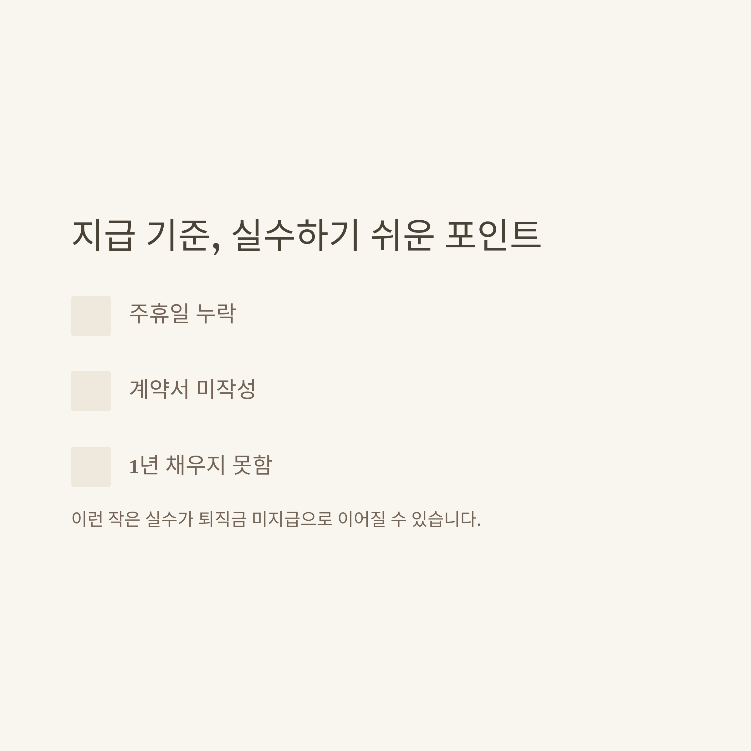 지급 기준 관련 자주하는 실수와 사례는 알바몬 퇴직금 가이드에서 추가 확인 가능합니다.