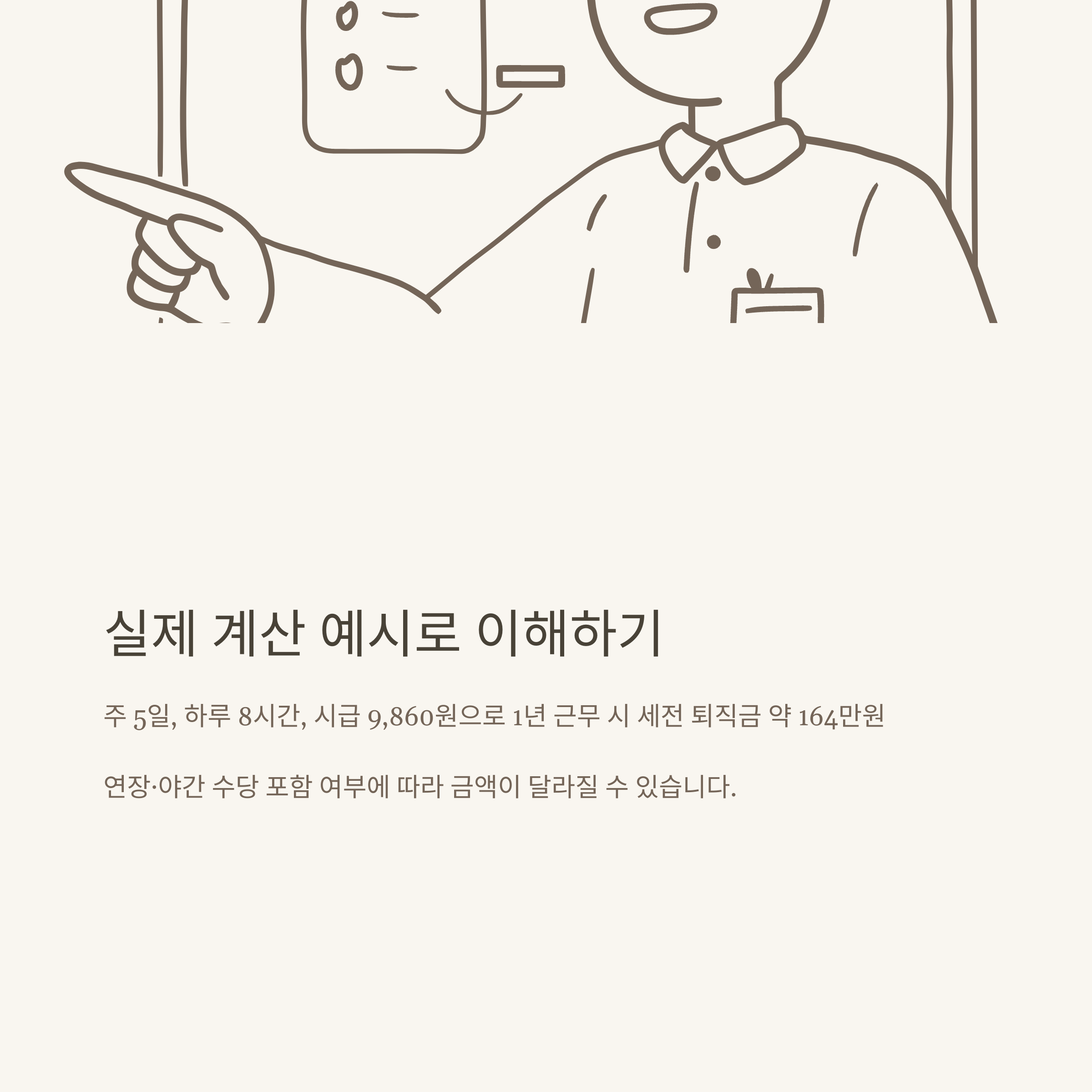실제 사례가 제일 이해하기 쉬웠던 것 같아요. 예를 들어 주 5일, 하루 8시간, 시급 9,860원으로 1년 동안 일했다면 월급 약 164만원(세전) 수준이 됩니다. 이때 평균임금이 164만원이면, 퇴직금은 세전 약 164만원으로 계산됩니다. 만약 중간에 연장수당, 야간수당 등이 포함된다면 해당 금액도 3개월 평균임금에 포함돼서 퇴직금이 올라가요. 저 역시 평소보다 연장근무가 많았던 3개월이 퇴직 직전이라, 생각보다 퇴직금이 높게 나와서 기분 좋았던 적이 있었죠. 자세한 예시는 고용노동부 계산기에서 입력 후 확인하세요.