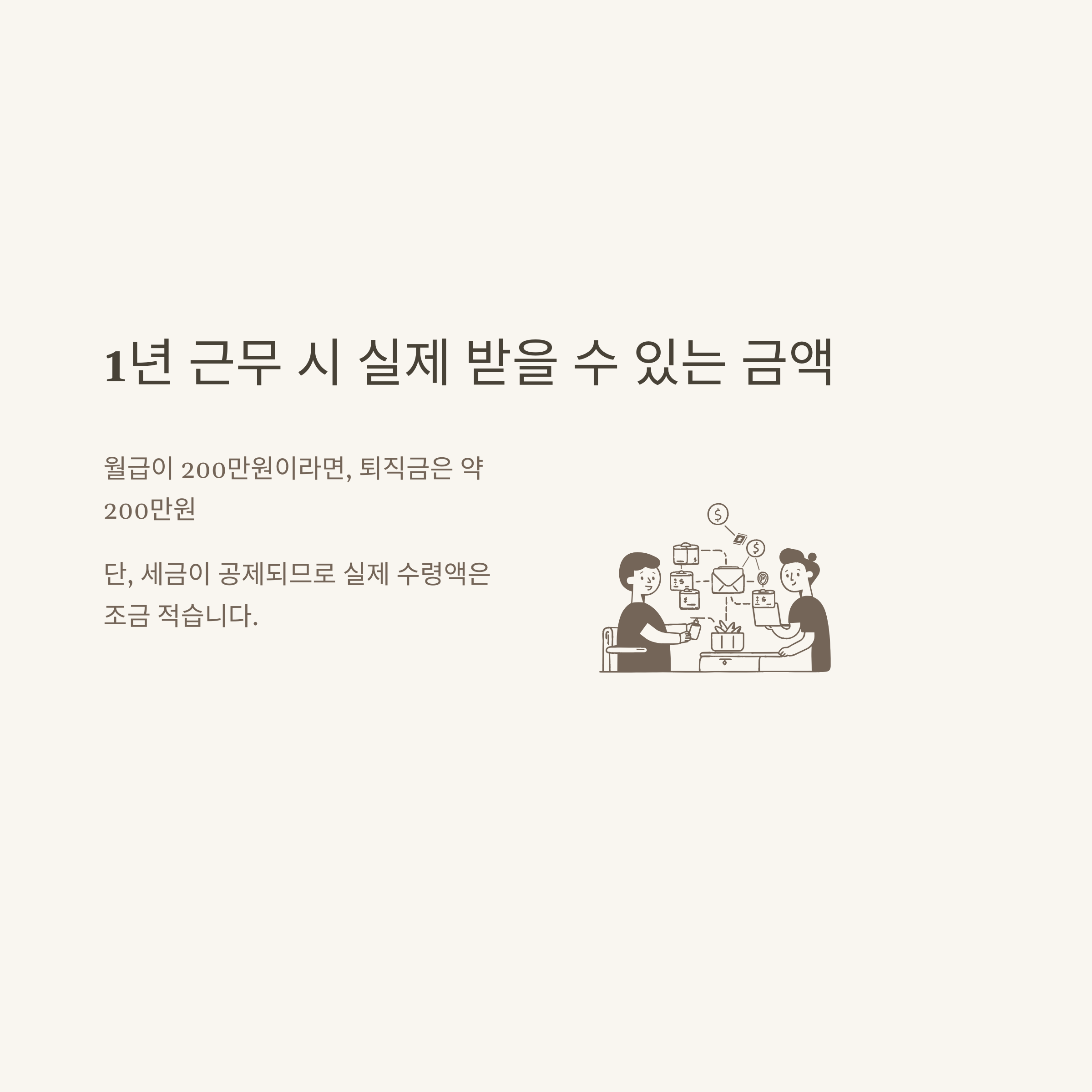 제가 직접 1년을 꽉 채우고 퇴직했던 적이 있습니다. 당시 월급이 200만원이었고, 별다른 추가수당 없이 주 5일, 하루 8시간 근무했어요. 1년을 꽉 채우면 대략 “1달치 급여”가 퇴직금으로 지급된다고 생각하시면 됩니다. 즉, 월급 200만원이면 세전 기준 약 200만원이 퇴직금으로 산정됩니다. 하지만 세후 실수령액은 소득세, 주민세 등이 소액 공제되어 조금 줄어듭니다. 실제 계산은 사람인 퇴직금 계산기에서 입력만 해보면 정확하게 알 수 있어요. 저는 처음 세후 실수령을 계산 안 하고 기대만 했다가 실제 입금액이 약간 적어서 조금 허탈했던 기억이 있네요.