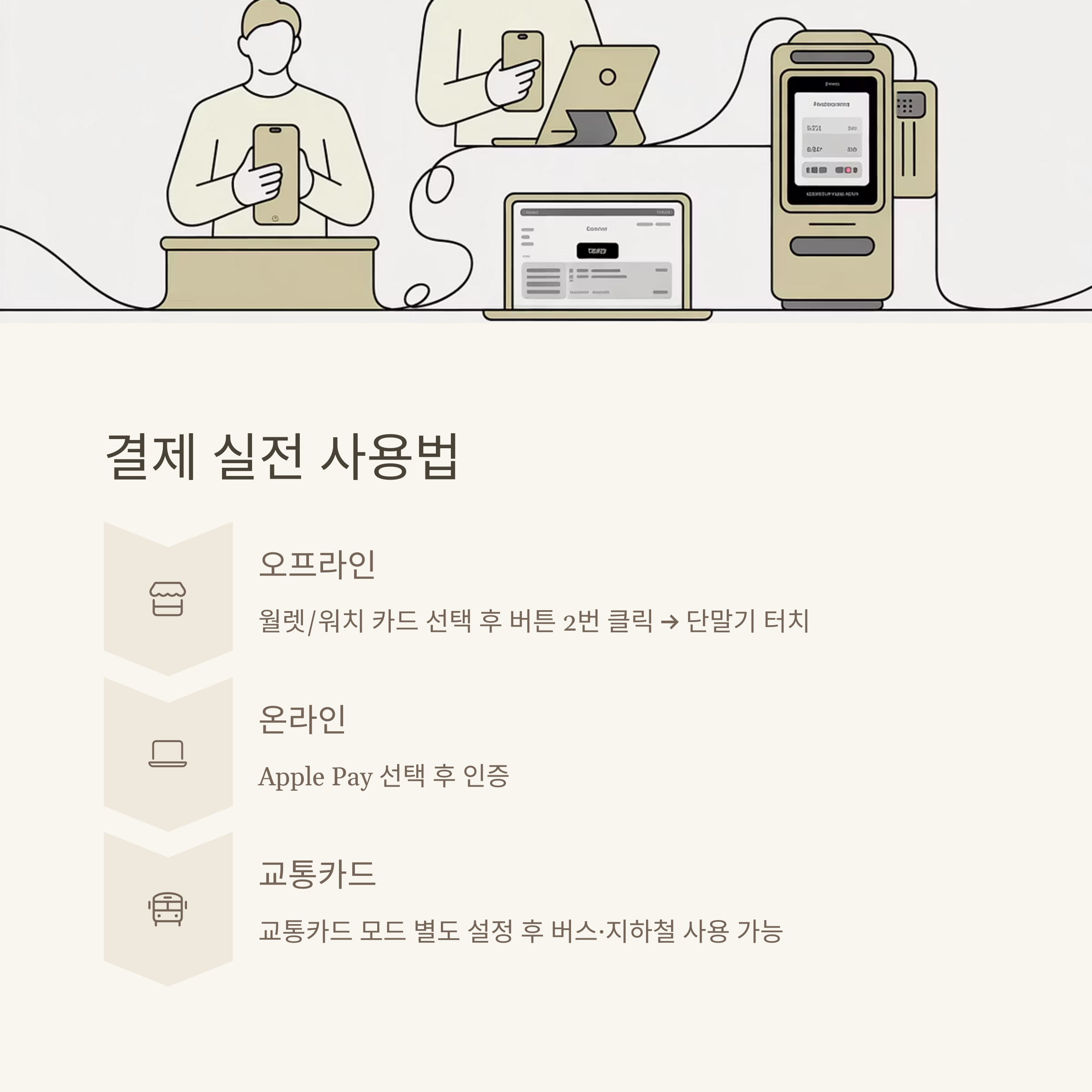 오프라인에서는 아이폰(혹은 워치)에서 월렛을 열고, 카드 선택 후 측면 버튼(또는 워치 측면 버튼)을 두 번 클릭한 뒤, 결제 단말기에 가까이 대면 바로 결제가 이뤄집니다. 인증은 Face ID나 지문, 워치 비밀번호로 이뤄지기 때문에 보안도 안심입니다.