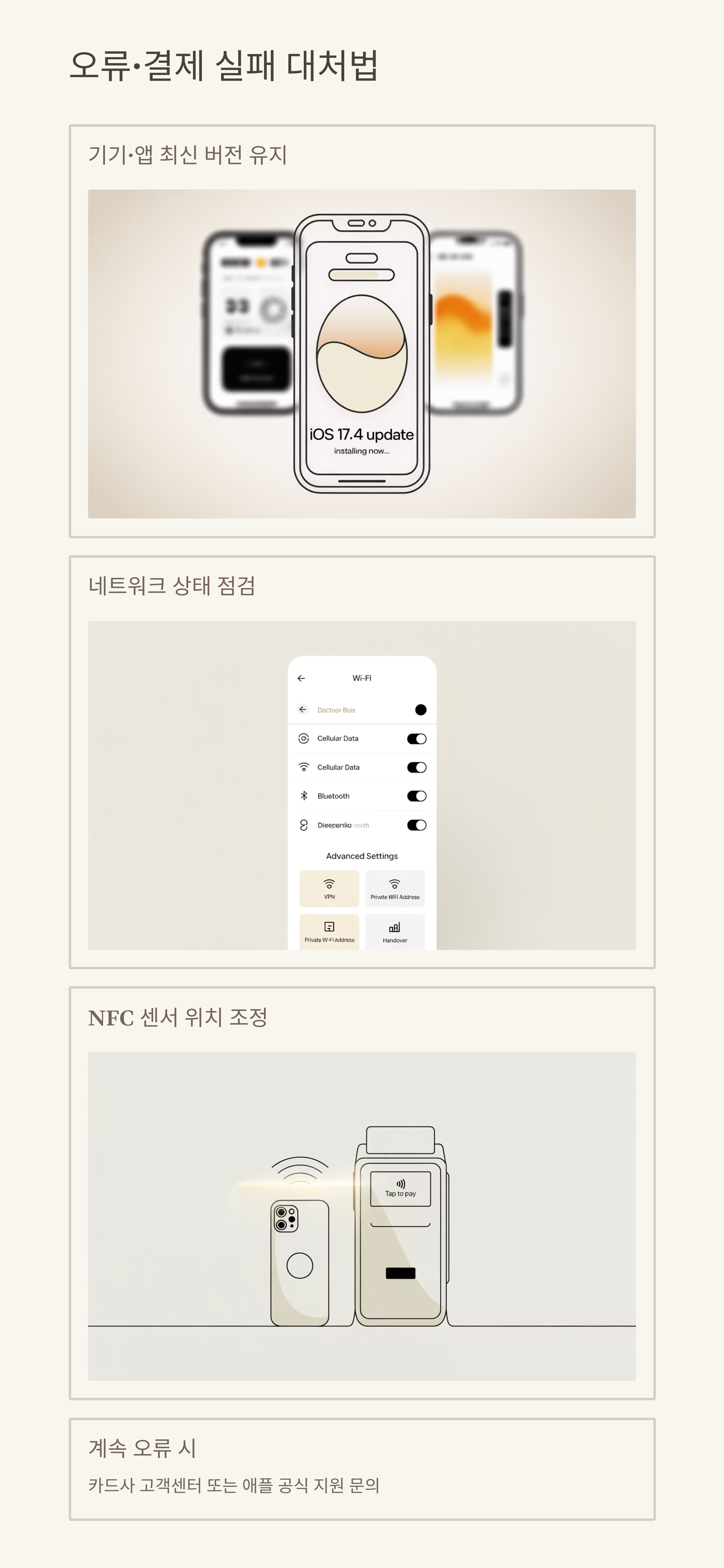 | 단말기 미인식 | 아이폰 상단 센서, 단말기 위치 재조정 | NFC 기능 활성화 필수 |