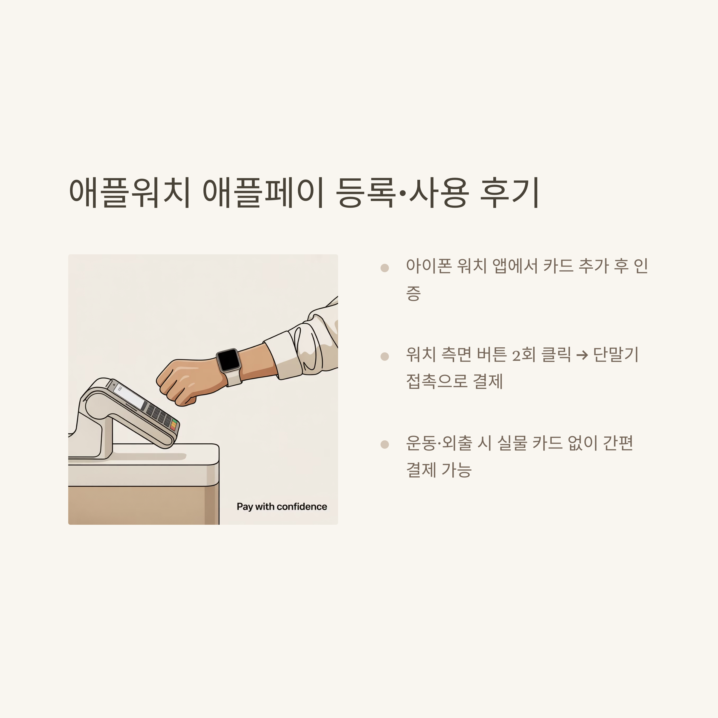 실제로 애플워치만 착용하고 외출했을 때, 지갑 없이도 결제할 수 있어서 진짜 신세계였습니다. 운동 갈 때, 집 근처 마트·카페에서 특히 강추드립니다.