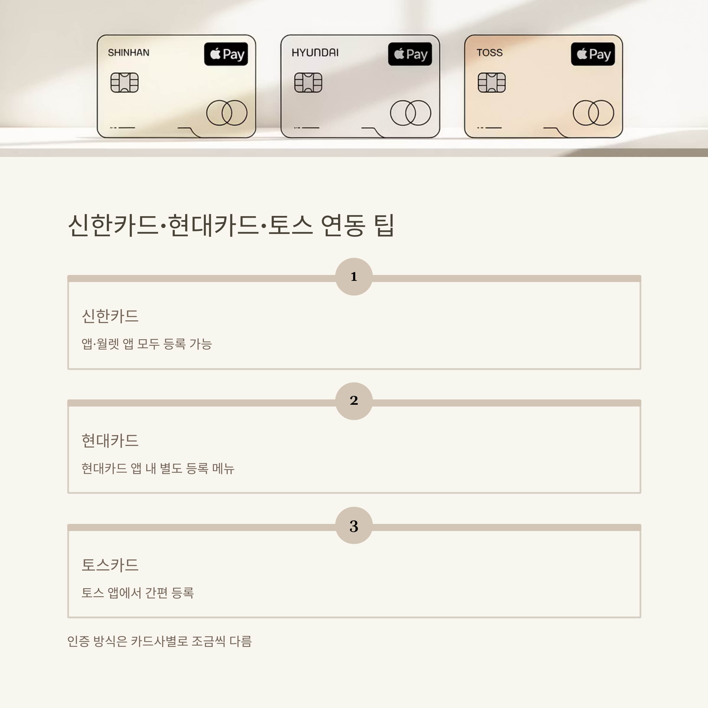 공식 카드사 안내: 신한카드 애플페이, 현대카드 애플페이, 토스카드 애플페이