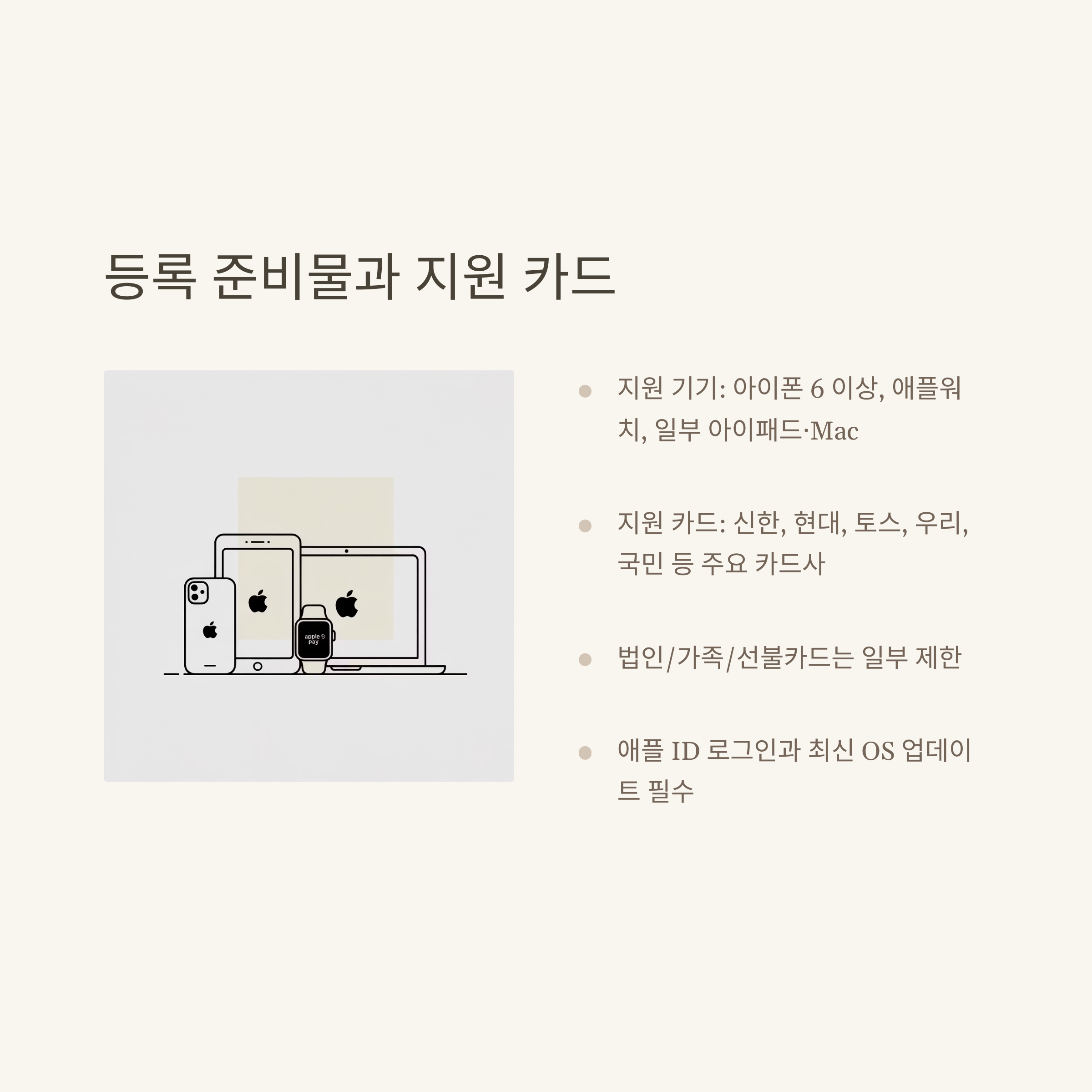 아이폰 6 이상(권장: iOS 16.4 이상), 애플워치 Series 1 이상, 일부 아이패드 및 Mac이 기본 조건이고, 카드의 경우 신한, 현대, 토스, 우리, 국민 등 점점 더 많은 카드사가 지원 중입니다. 단, 법인카드, 선불/가족카드, 일부 제휴카드는 지원이 제한될 수 있으니 사전에 카드사 공지나 애플 공식 안내를 꼭 한 번 더 확인하는 게 좋습니다.