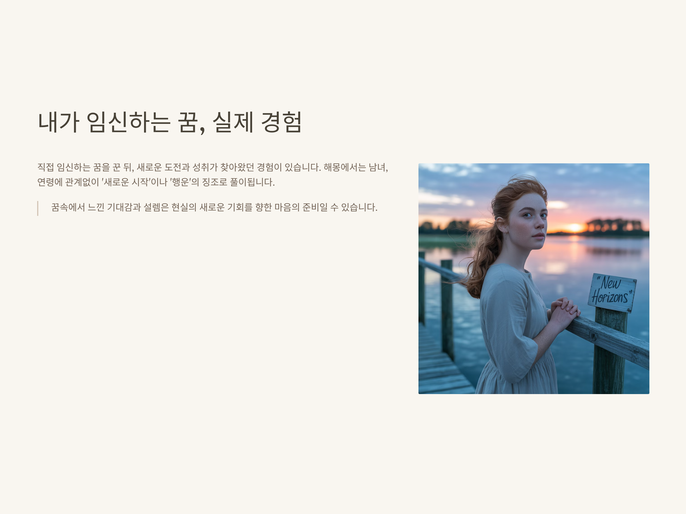 | 내가 임신하는 꿈 | 새로운 출발, 성취, 행운 | 프로젝트 성공, 기회 |