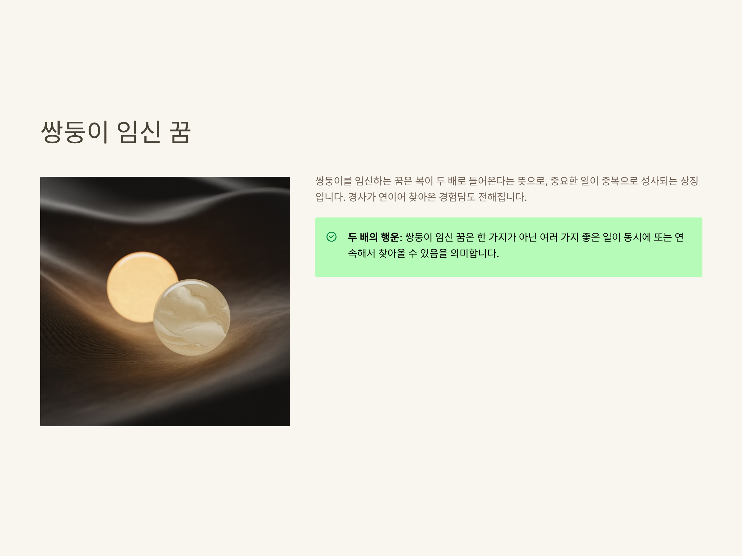 | 쌍둥이 임신 꿈 | 복이 두 배, 중복 경사 | 두 가지 좋은 일 |