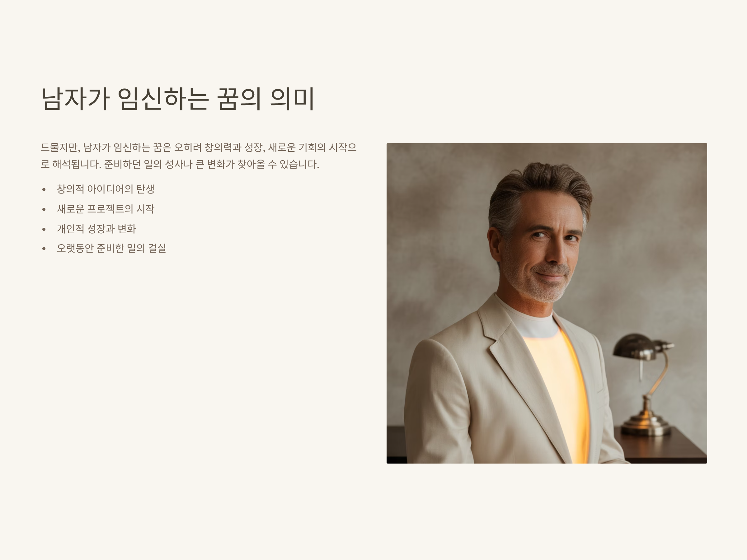 | 남자가 임신하는 꿈 | 창의력, 성장, 행운 | 사업, 새로운 도전 |