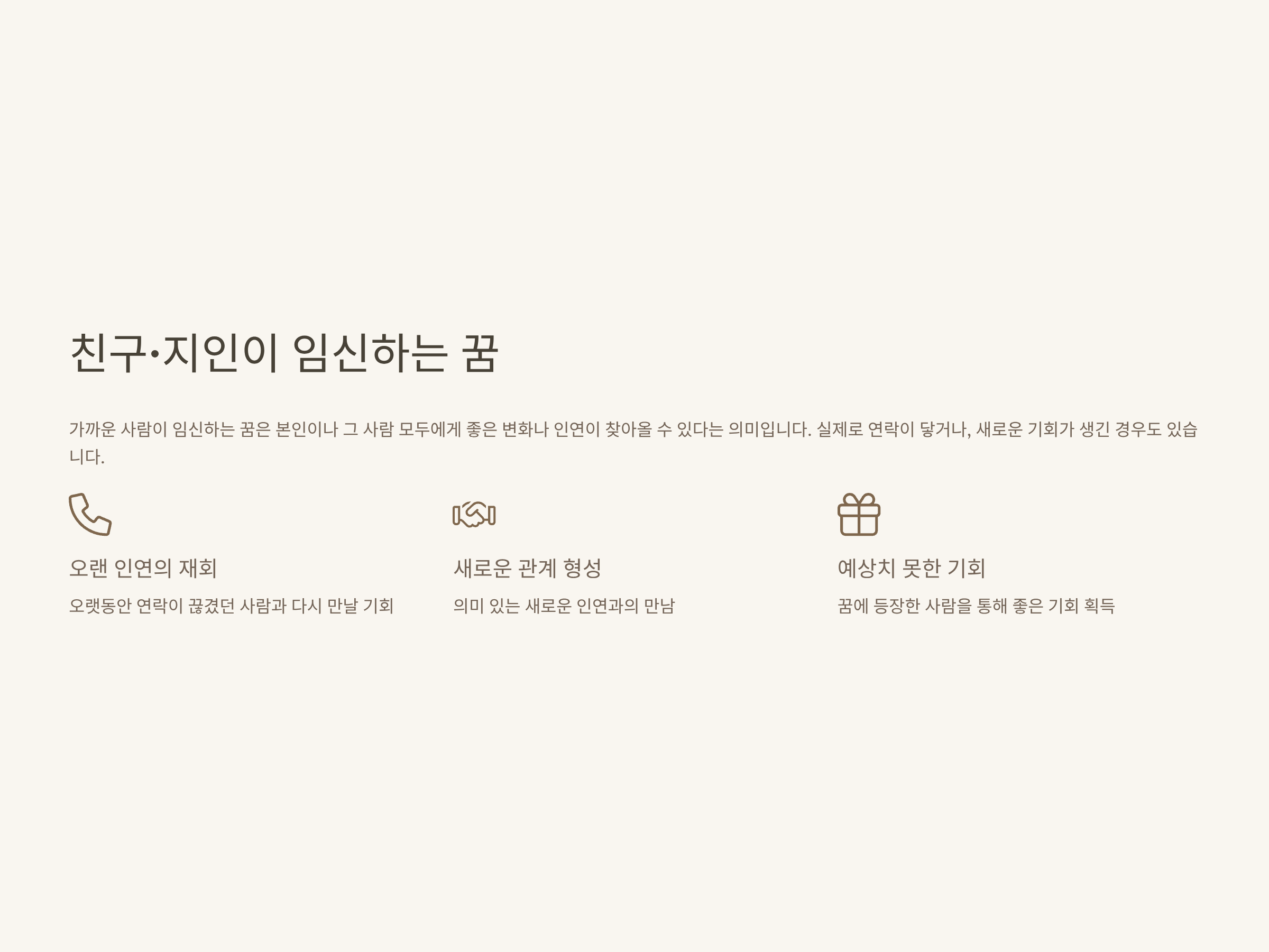 | 친구/지인 임신 | 주변 변화, 인연, 기회 | 관계 개선, 연락 |