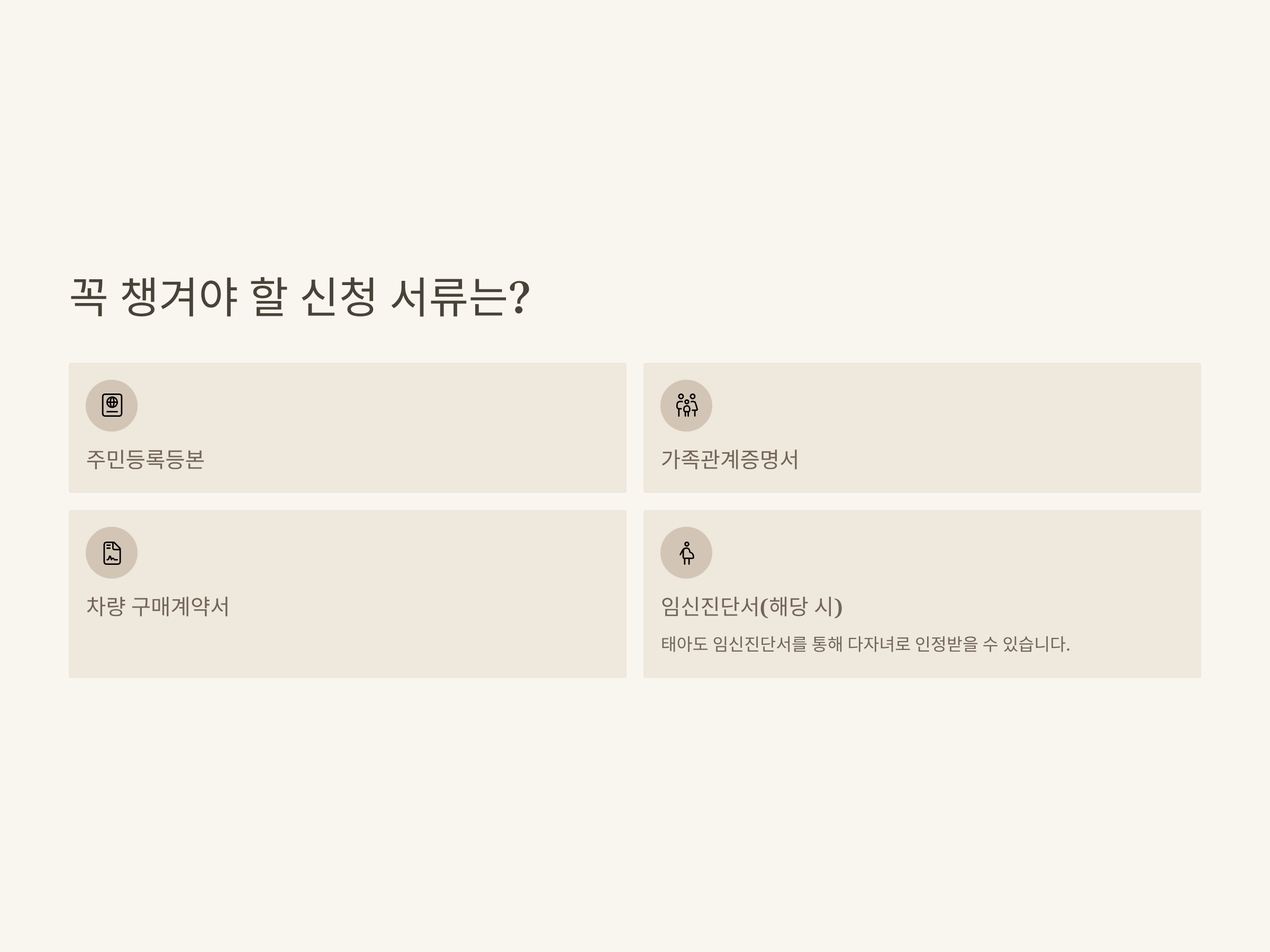 다자녀 기준은 18세 이하 자녀의 ‘주민등록 등본’ 또는 ‘가족관계증명서’로 모두 증빙해야 하며, ‘태아’의 경우는 임신진단서, 출산예정일이 포함된 서류로 대체 가능해요. 이 부분은 실제 보조금 심사 시 가장 많이 문의하는 부분이기도 합니다.