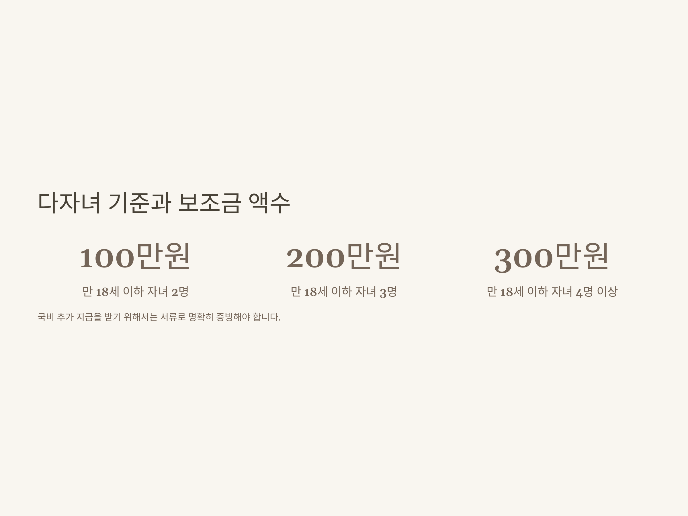 - 3자녀: 200만 원, 4자녀 이상: 300만 원(국비)