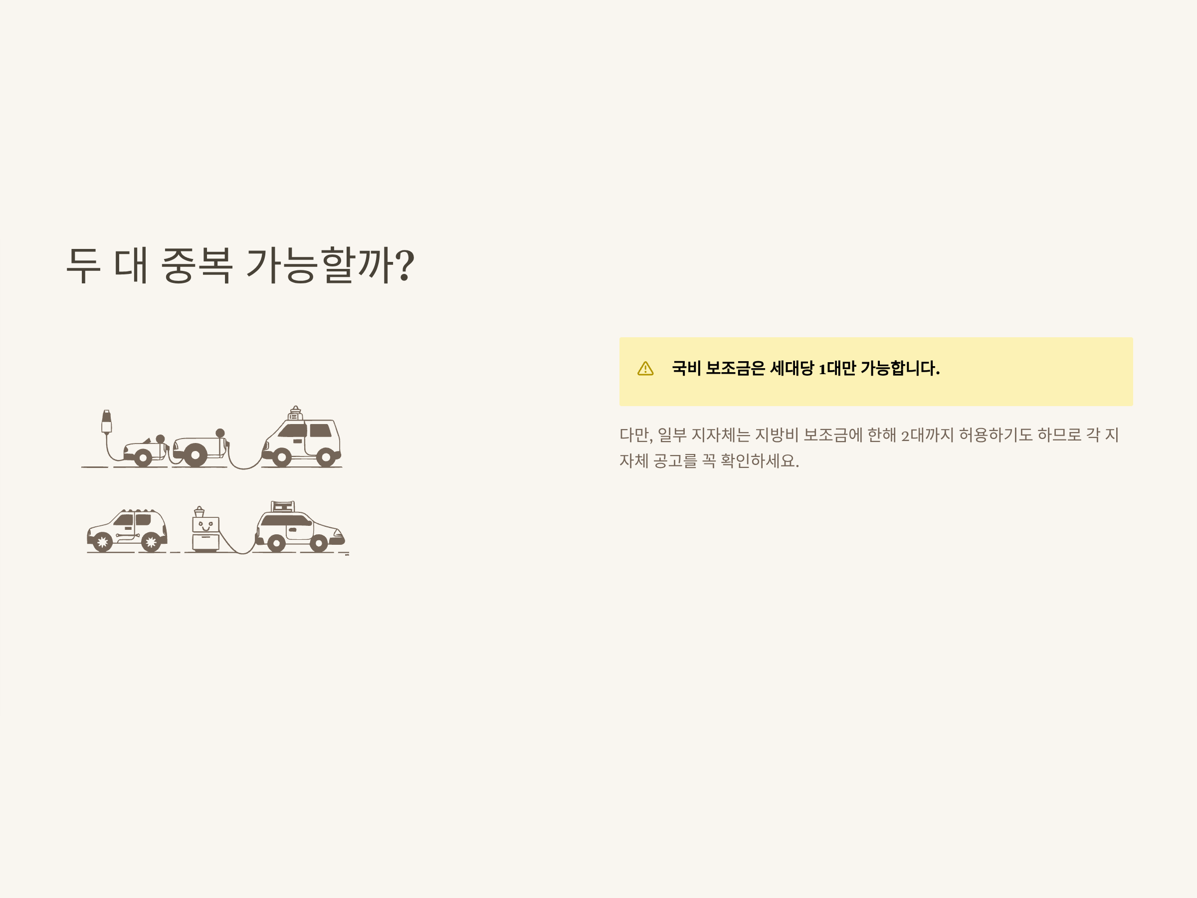 A. 아니요. 원칙적으로 세대별 1대만 국비 보조금 지원이 가능합니다. 단, 지방비 보조금 일부 지역에서 예외가 있으니 공고문을 꼭 확인하세요.