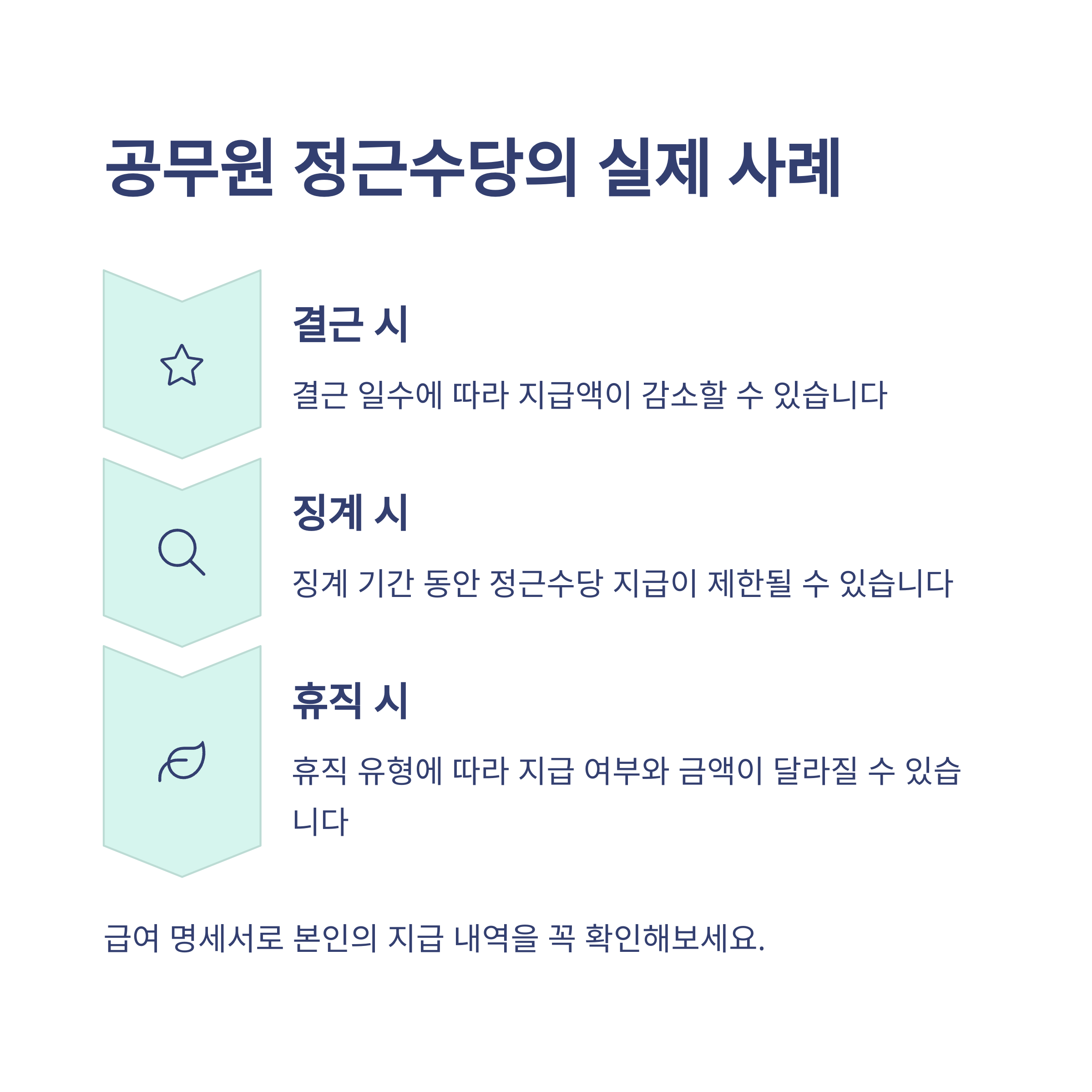 예를 들어, “2024년 7월 기준 2년차 9급 공무원”이라면 월 기본급의 50%가 정근수당으로 책정됩니다. 다만, 중간에 결근이 많거나 징계처분 이력이 있으면 금액이 줄어들 수 있죠. 저도 한 번, 결근일을 실수로 체크하지 않았다가 지급액이 달라졌던 경험이 있습니다.