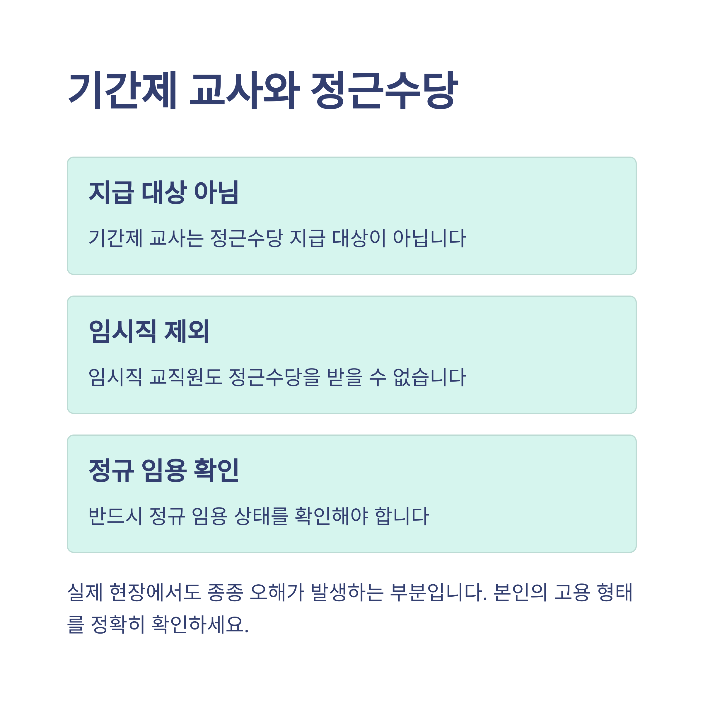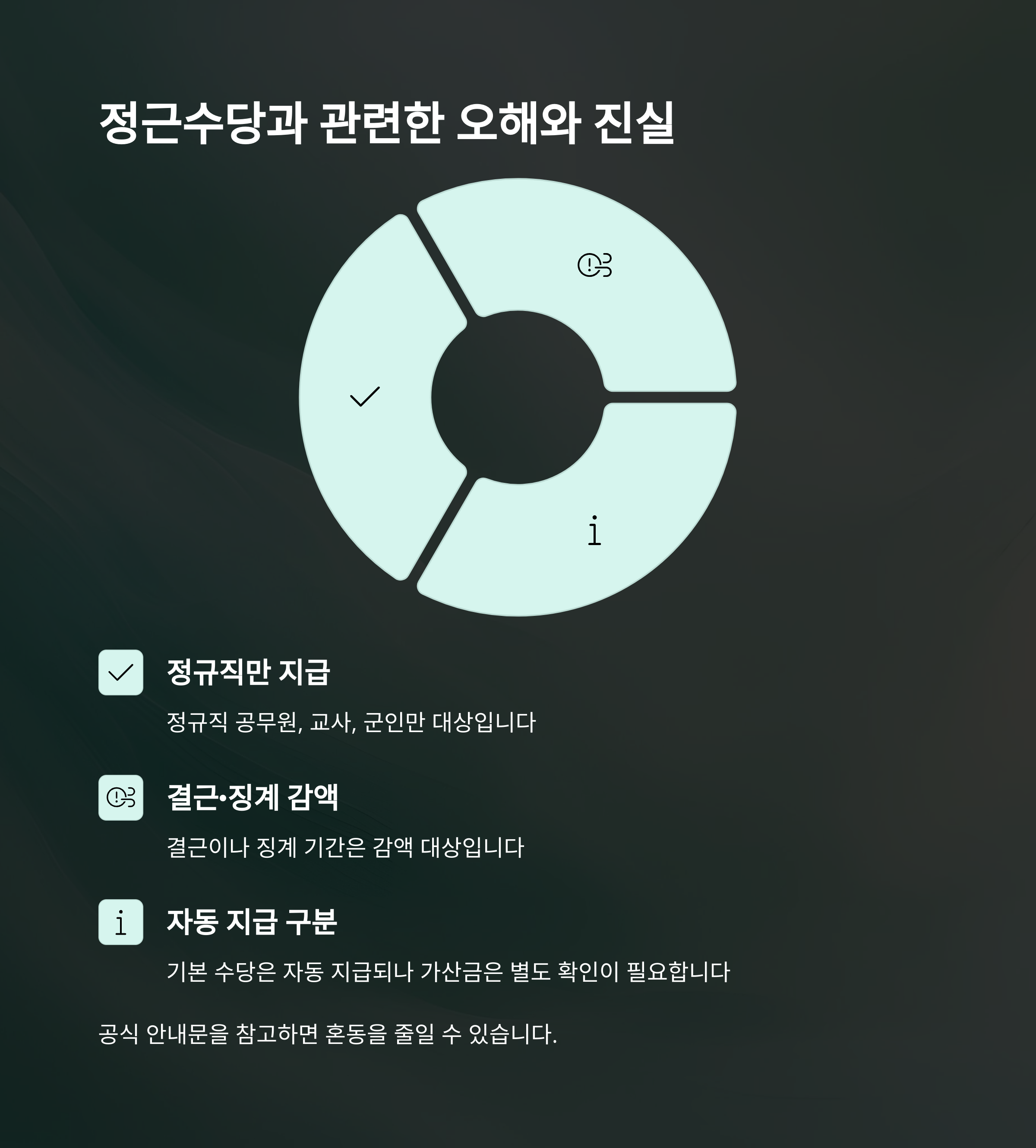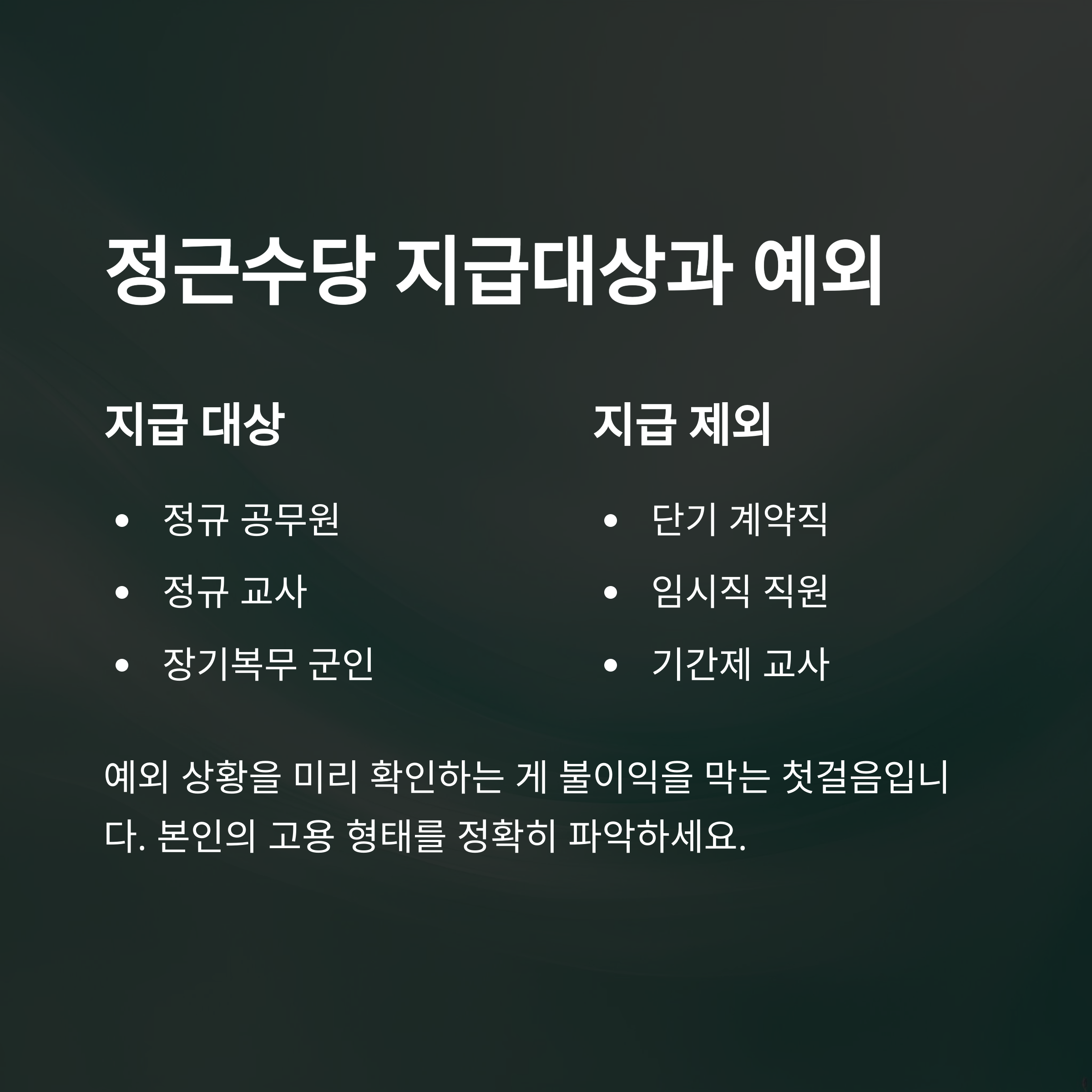 | 지급대상 | 정규 공무원·교사·군인 등 | 기간제·임시직 제외 |