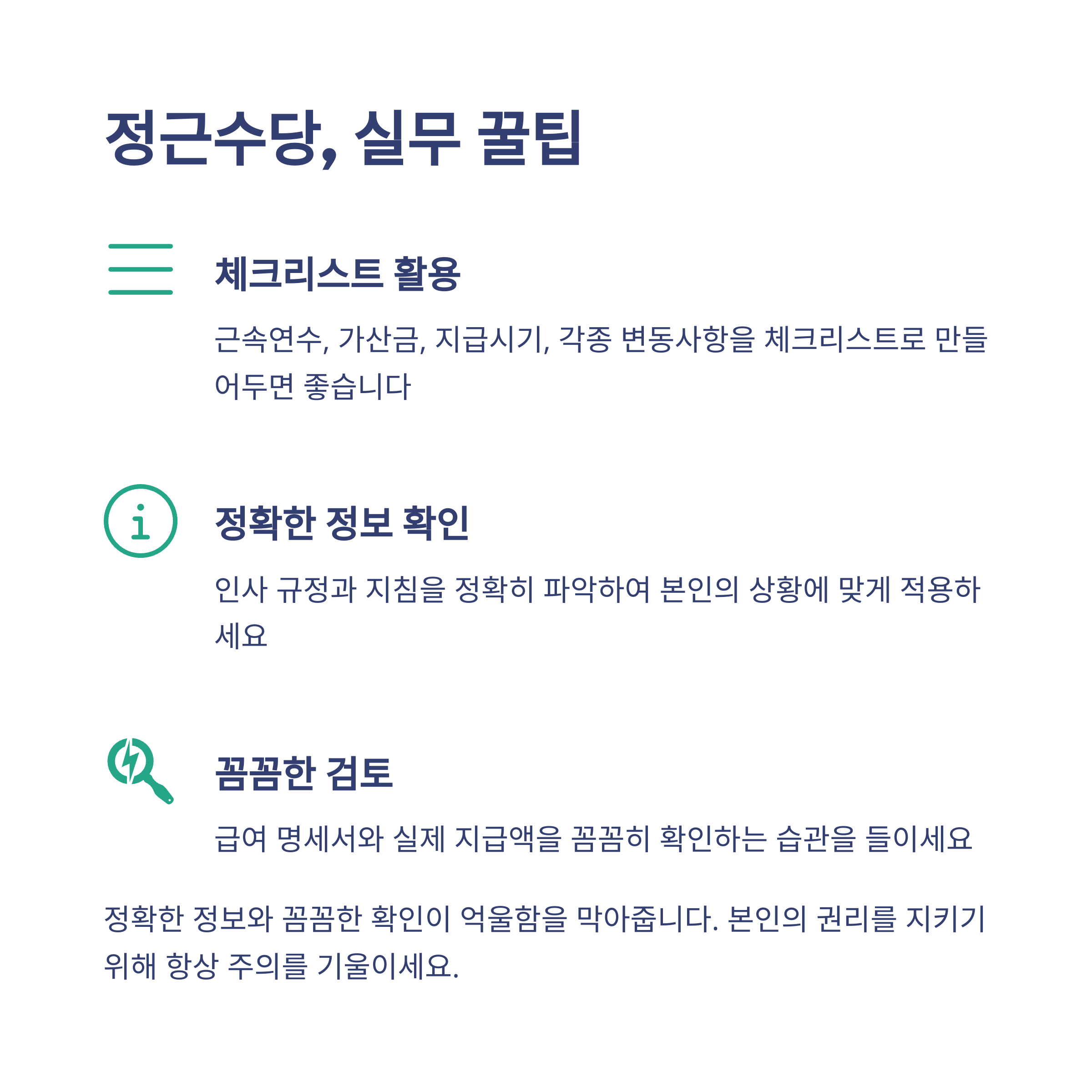 예전에 동료가 전입 후 근속연수가 빠져 정근수당을 못 받은 적이 있었는데, 인사팀에 소명 자료를 제출해서 겨우 소급 지급을 받았습니다. 사소해 보여도 작은 실수로 인해 몇 십만 원이 왔다 갔다 하니, 꼭 체크리스트를 만들어두시길 추천합니다.